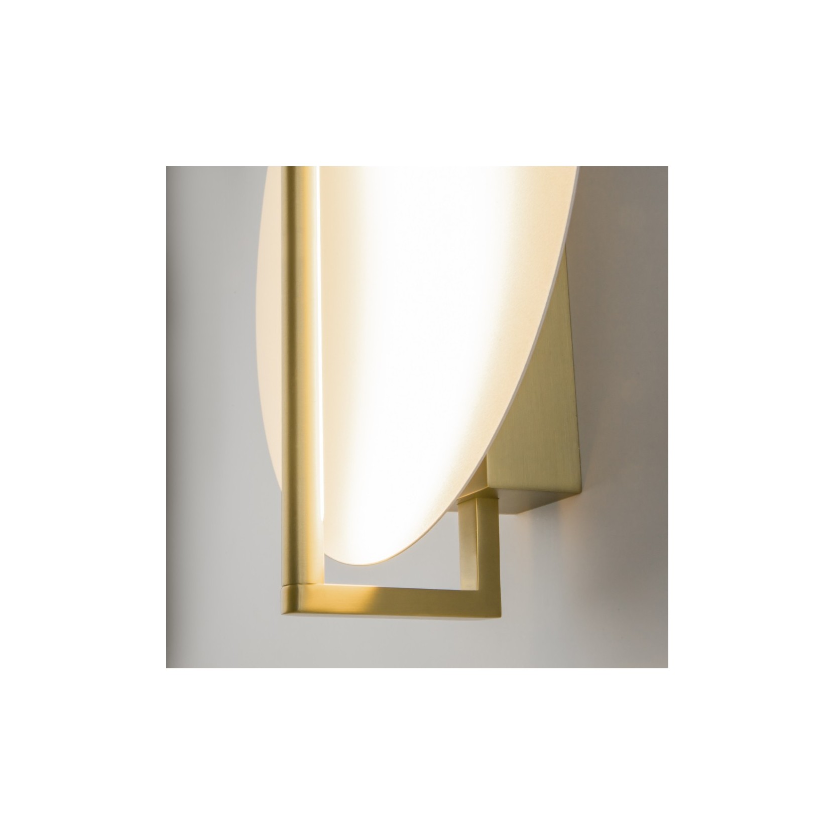 The Mira lamp stands out for its essential and rigorous design, consisting of a large diffusing disk in satin opal glass intersected vertically by a slender burnished metal profile. This metal "axis" serves not only as a structural support but also visually bisects the circle of light, creating a perfect balance between solid and void, light and shadow. The final effect evokes astronomical phases, bringing a touch of rationalist poetry to the wall.