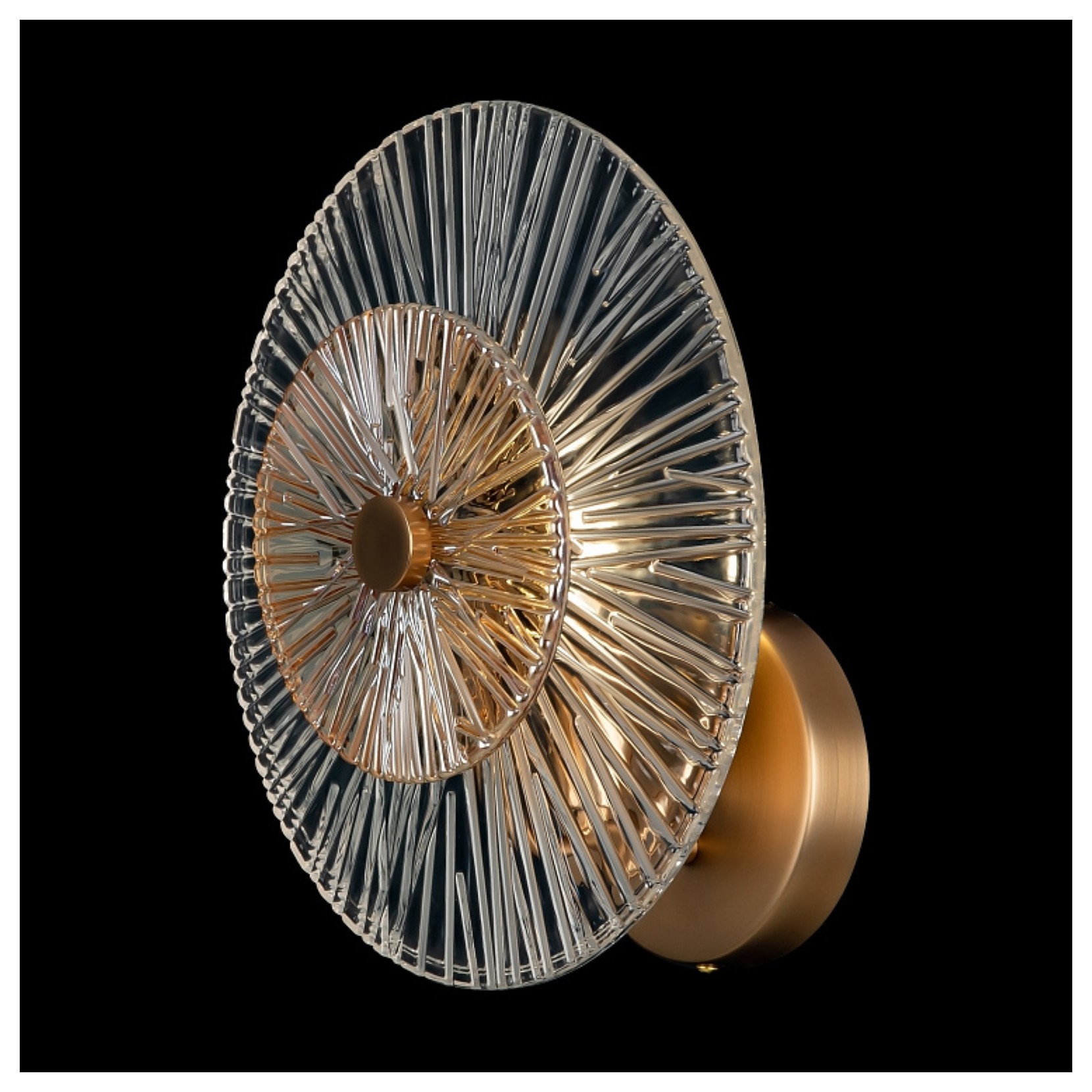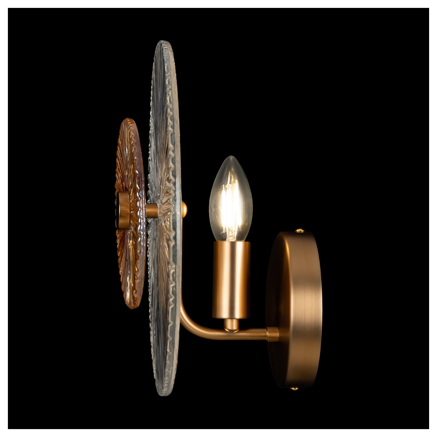 Maytoni has designed the Aster wall lamp, the metal structure in a gold tone is bordered by circles in printed glass with amber and transparent shades that alternate. Applique is perfectly suited to both classic and modern environments.