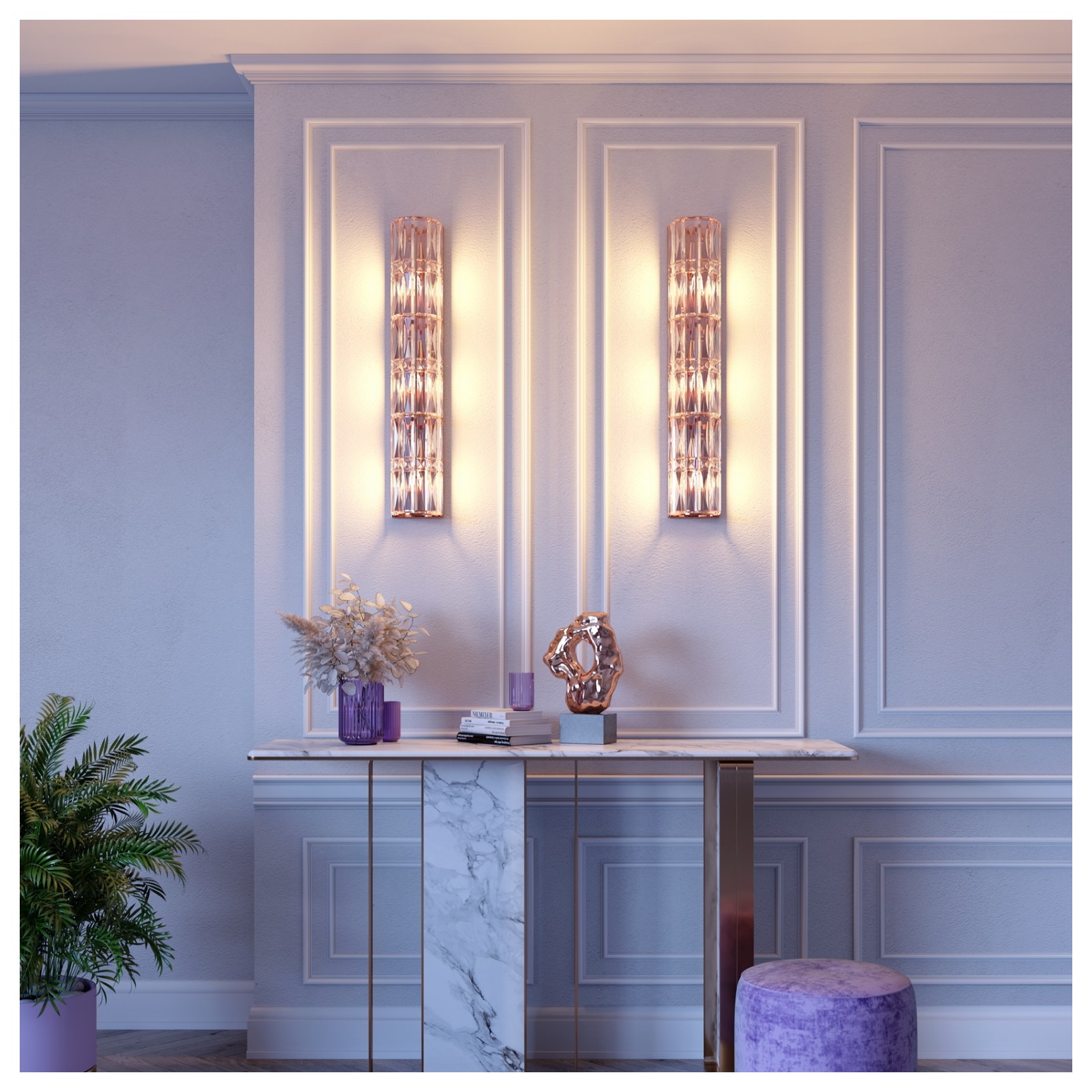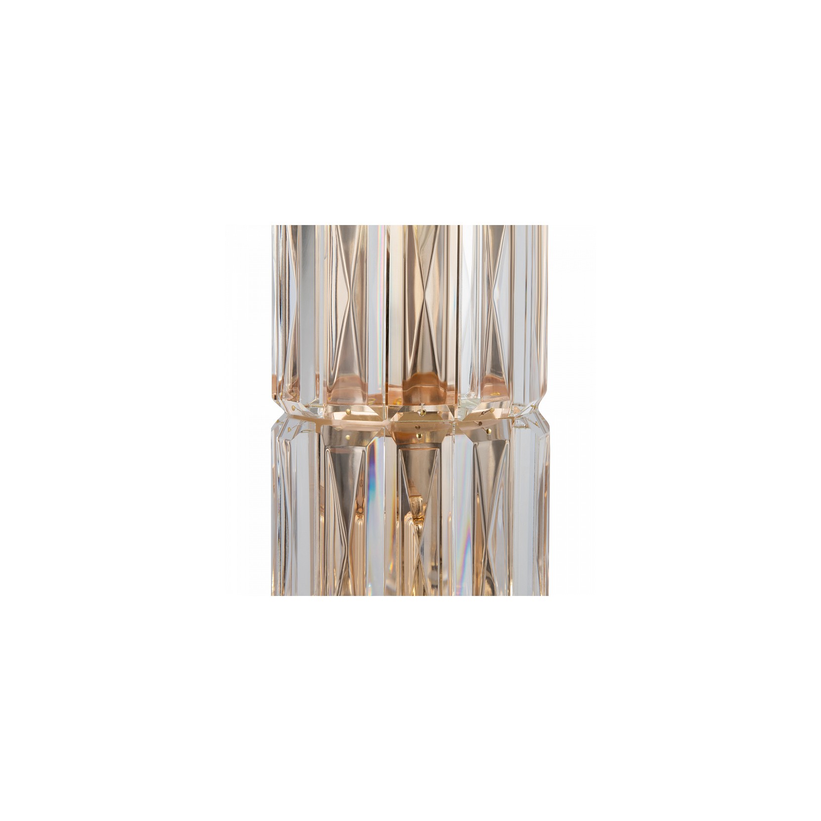The FACET wall lamp consists of a gold and chrome metal frame and glass lampshade. The architectural cut decorative crystal.