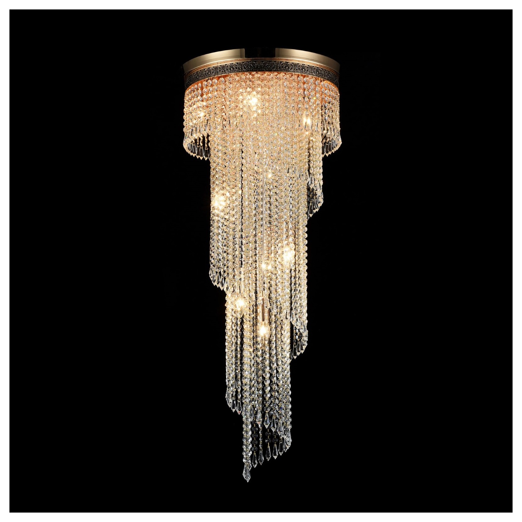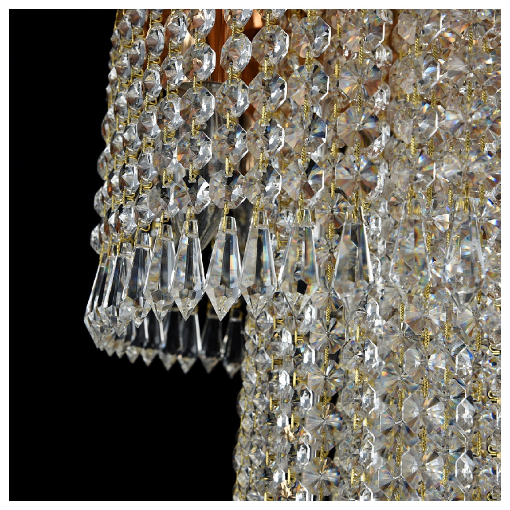 The CASCADE wall lamp is a praise for the elegance of glass revisited following the neoclassical style. The structure of the lamp in the antique gold finish sees embedded octagonal crystals and geometric crystal pendants.