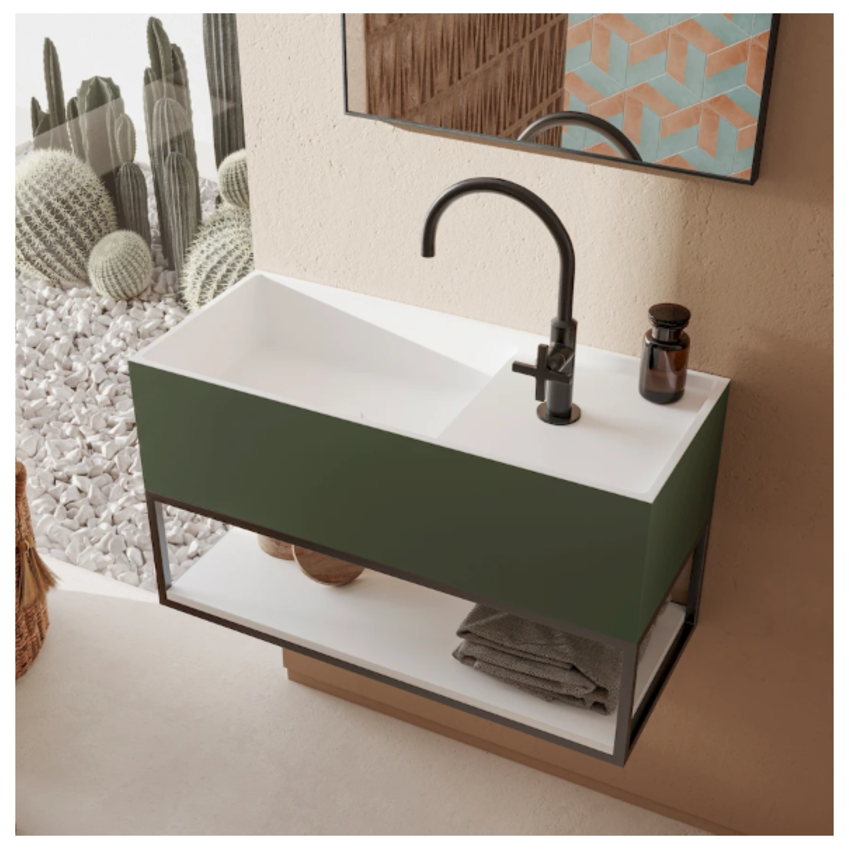 The GUEST wall-mounted handwashing collection is available in 9 different sizes. The material used for the realization of the product is the Scene Solid Surface, with the possibility of external coloring in all standard colors, both basic and trend or special colors. The washbasins can be both freestanding and with structure, there are also two versions available: GUEST L with bathtub on the left and GUEST R with bathtub on the right.
