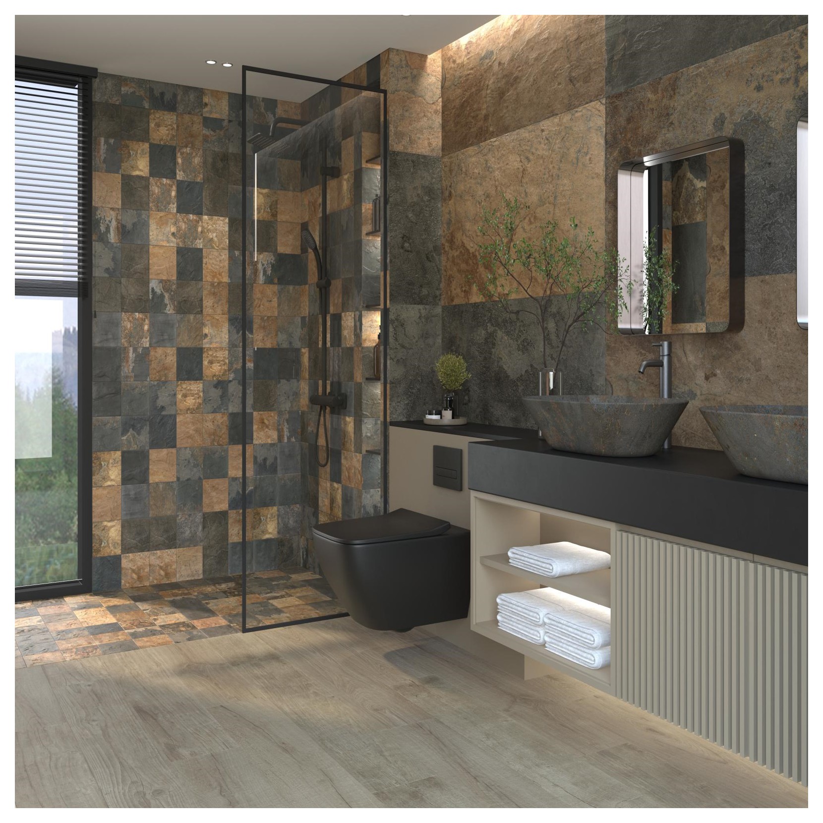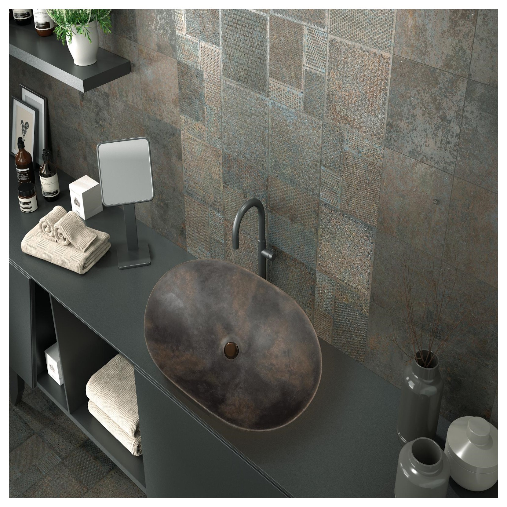 Oxide porcelain washbasin (59x42x14 cm), hand-decorated inspired by the tiles of the OXIDE series. Modern design with large dimensions and thin walls, its surface recalls the appearance of rusted metal.