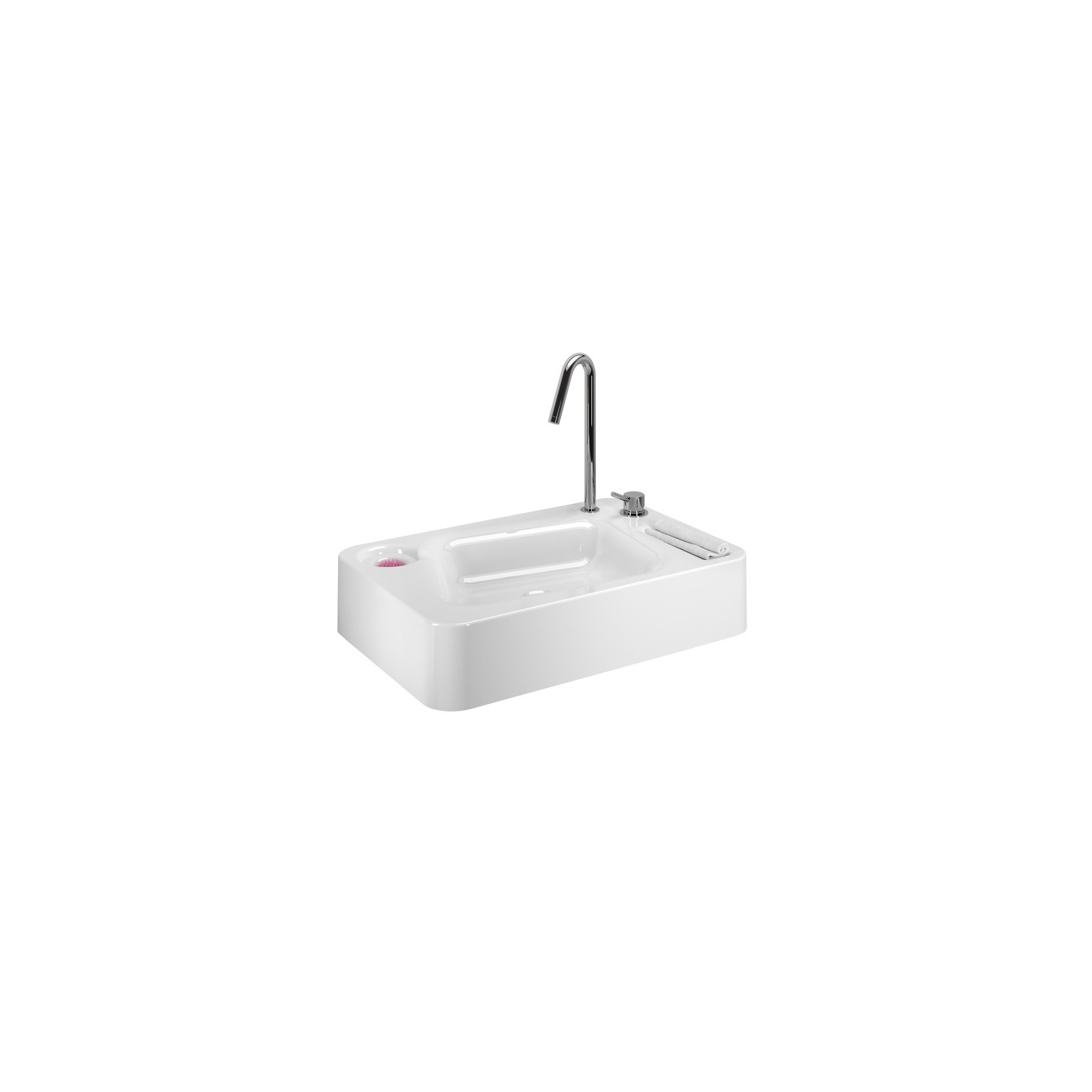 Ceramic sink with overflow, complete with tap, mixer, drain and soap dish grill.