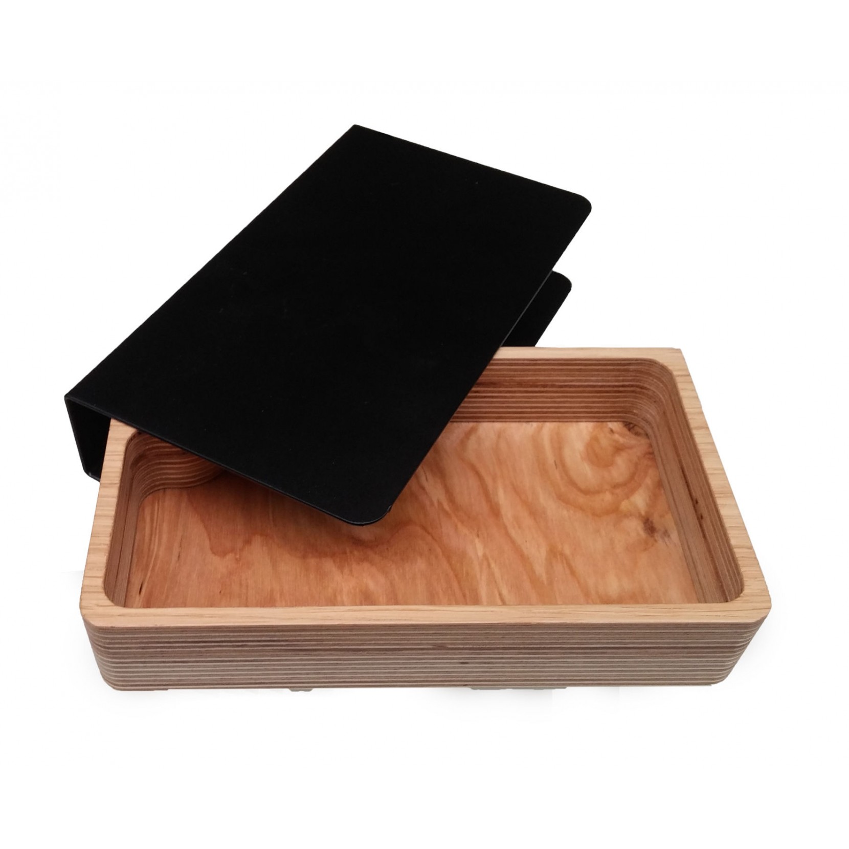 Une boîte avec système douverture rotative en tôle dacier vernie et fond en contreplaqué de bouleau plaqué chêne fait partie du kit daccessoires pour le bureau Portable Atelier Collection qui permet de personnaliser et de rendre plus fonctionnel lespace labeur.