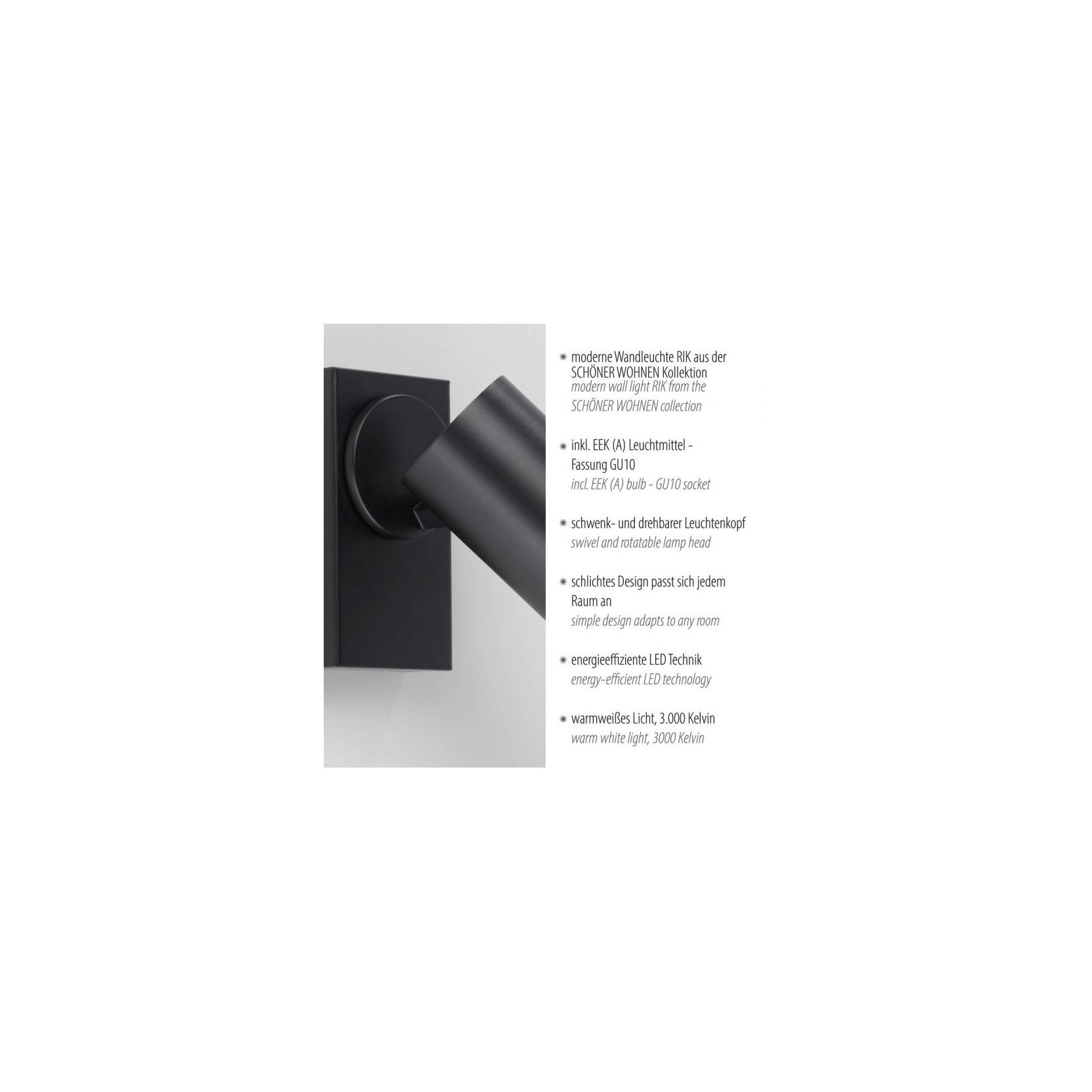 Livré avec une ampoule LED GU10 (3000 K), RIK diffuse une agréable lumière blanc chaud qui crée une ambiance chaleureuse – idéale dans les couloirs, les salons ou les chambres. Atout pratique : son spot orientable et inclinable permet de diriger le faisceau lumineux avec précision, parfait pour mettre en valeur certaines zones ou objets.