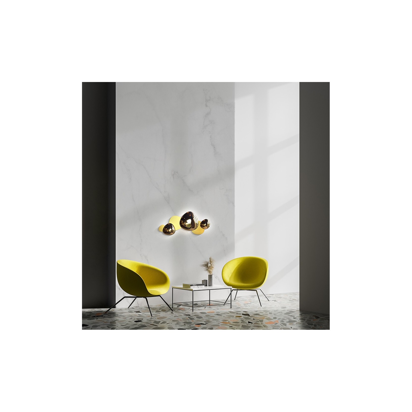 L'applique Jack-Stone se distingue par sa composition dynamique inspirée par la forme des galets polis par l'eau. Ce luminaire ne se limite pas à éclairer, il interagit avec l'espace environnant en reflétant l'ambiance tel de petits miroirs convexes. La structure est complétée par des disques plats coordonnés faisant office de réflecteurs, créant un jeu sophistiqué de profondeur et de lumière indirecte sur le mur.