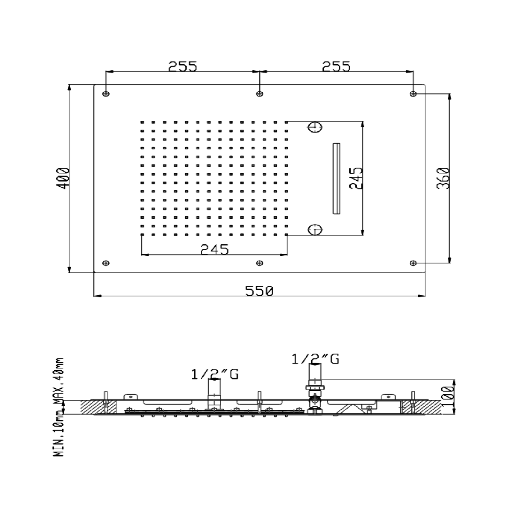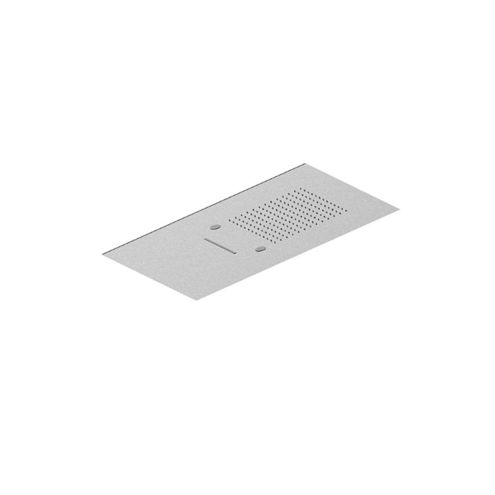 F.lli Frattini propose la série Contemporary Douches Inox. Pomme de douche anticalcaire encastrée au plafond en acier inoxydable 55x40 cm à trois fonctions : pluie, cascade et nébulisation.