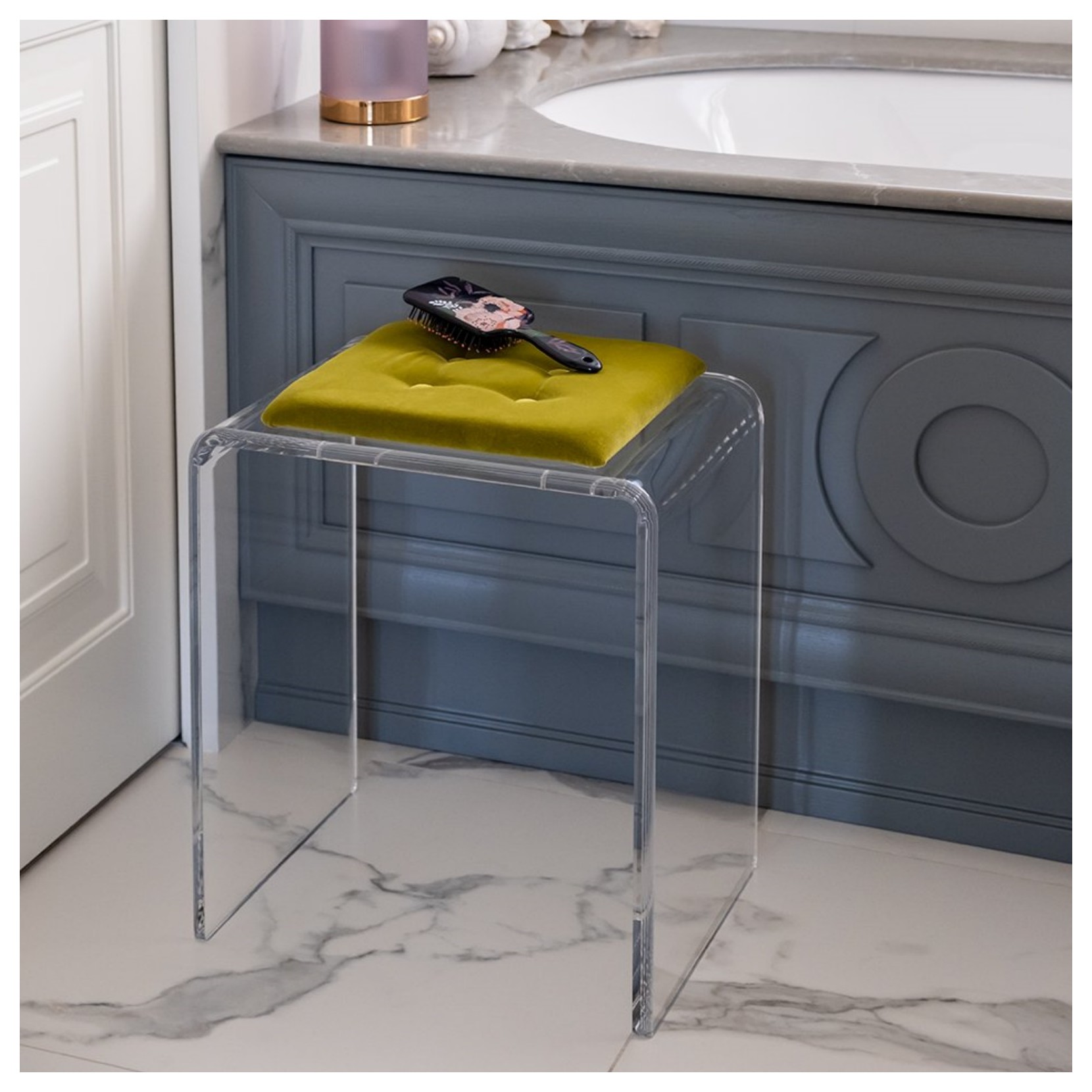 Jago est un tabouret en cristal acrylique transparent avec une assise souple recouverte de velours coloré. Disponible en 8 couleurs : noir, violet, poudre, tourterelle, orange, vert, octane, turquoise.  Sa transparence peut être utilisée pour mettre en valeur un sol particulier.