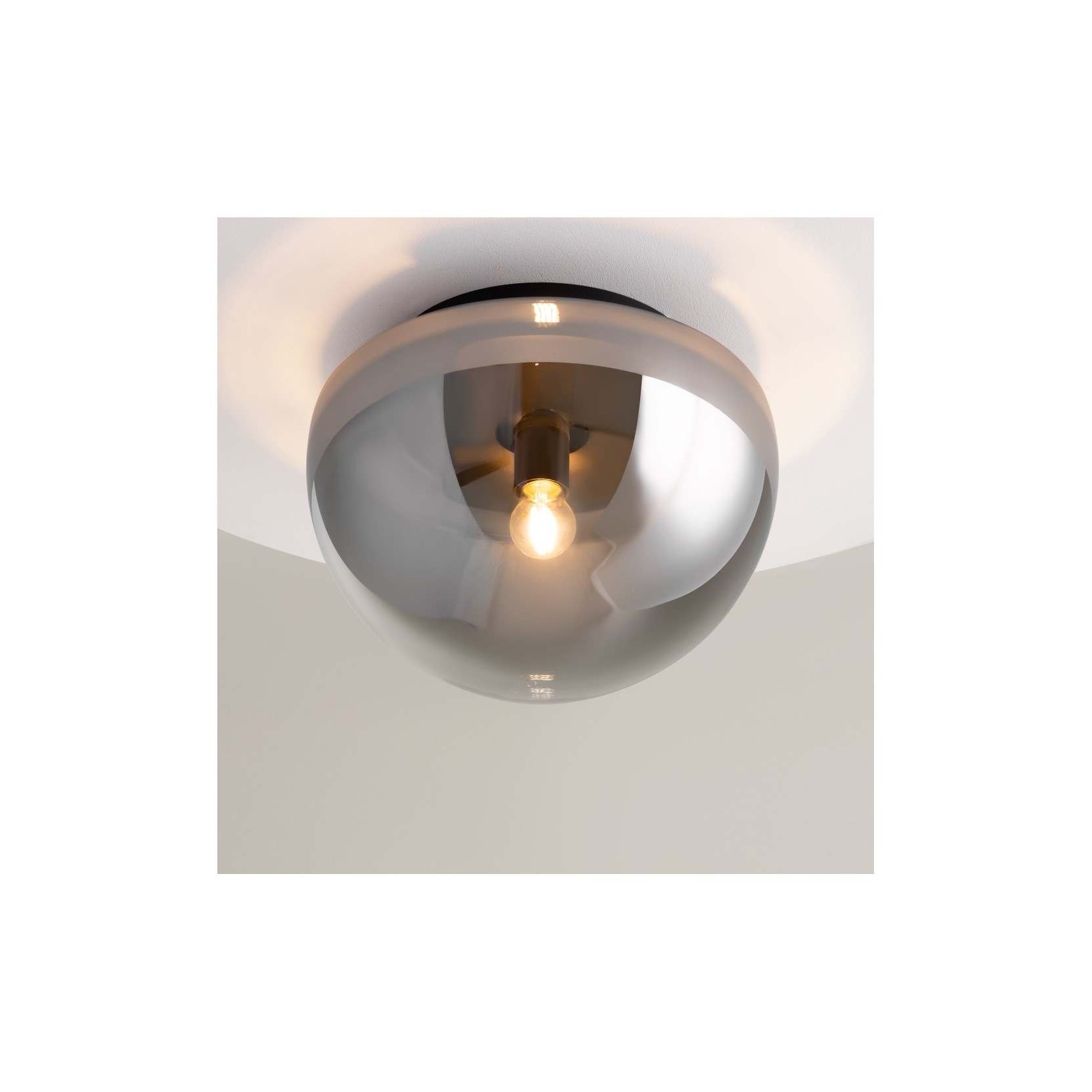 Le plafonnier Glassy transforme le plafond en un point focal magnétique grâce à son diffuseur hémisphérique en verre dégradé. Caractérisé par une finition argent miroir qui s'estompe progressivement vers la transparence, ce luminaire crée un jeu visuel intrigant : éteint, il ressemble à un solide métallique sculptural, tandis qu'allumé, il révèle le cœur lumineux à l'intérieur, diffusant une lumière chaude et sans éblouissement.