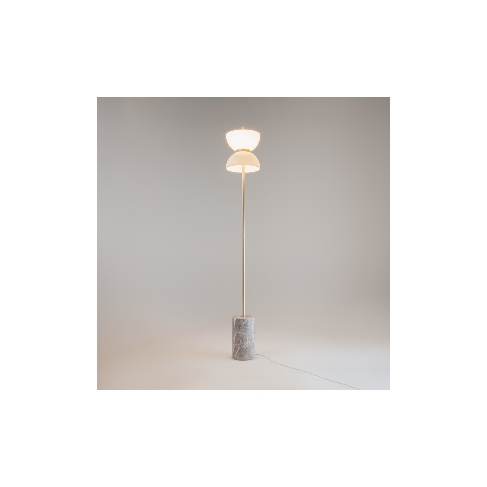 La lampe Kyoto se distingue par son design élancé et par l'association raffinée des matériaux. La structure s'élève d'une base cylindrique solide en marbre veiné, qui apporte stabilité et une touche de classicisme contemporain. La tige fine en or satiné culmine dans un double diffuseur en coupole opposée, créant une silhouette qui rappelle un sablier lumineux ou une fleur stylisée.