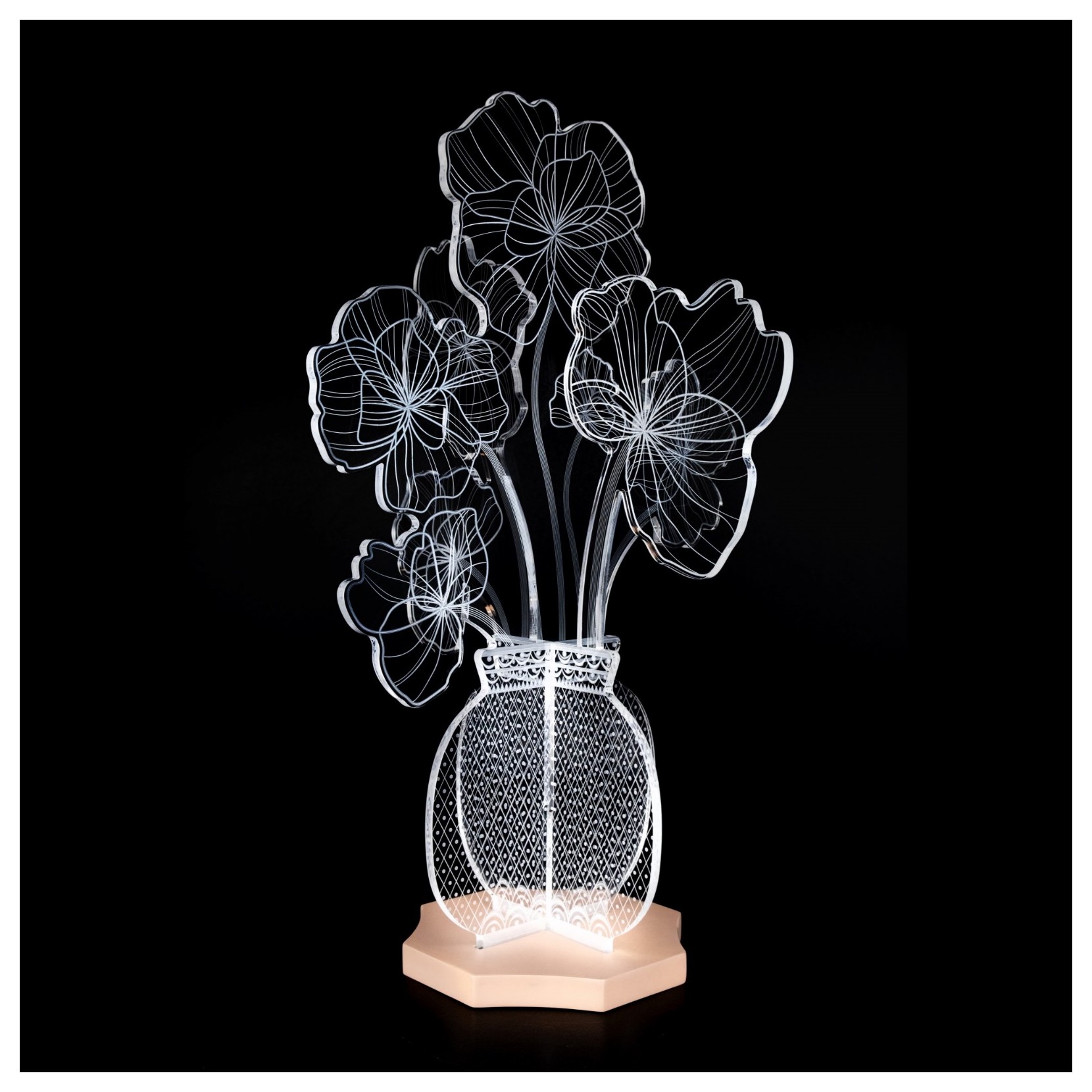 La lampe voit la combinaison de deux plaques de verre gravées et façonnées, entrelacées créant un effet particulier de diffusion de la lumière, le tout est combiné avec une base qui donne une touche de couleur neutre qui fait ressortir les gravures au laser.