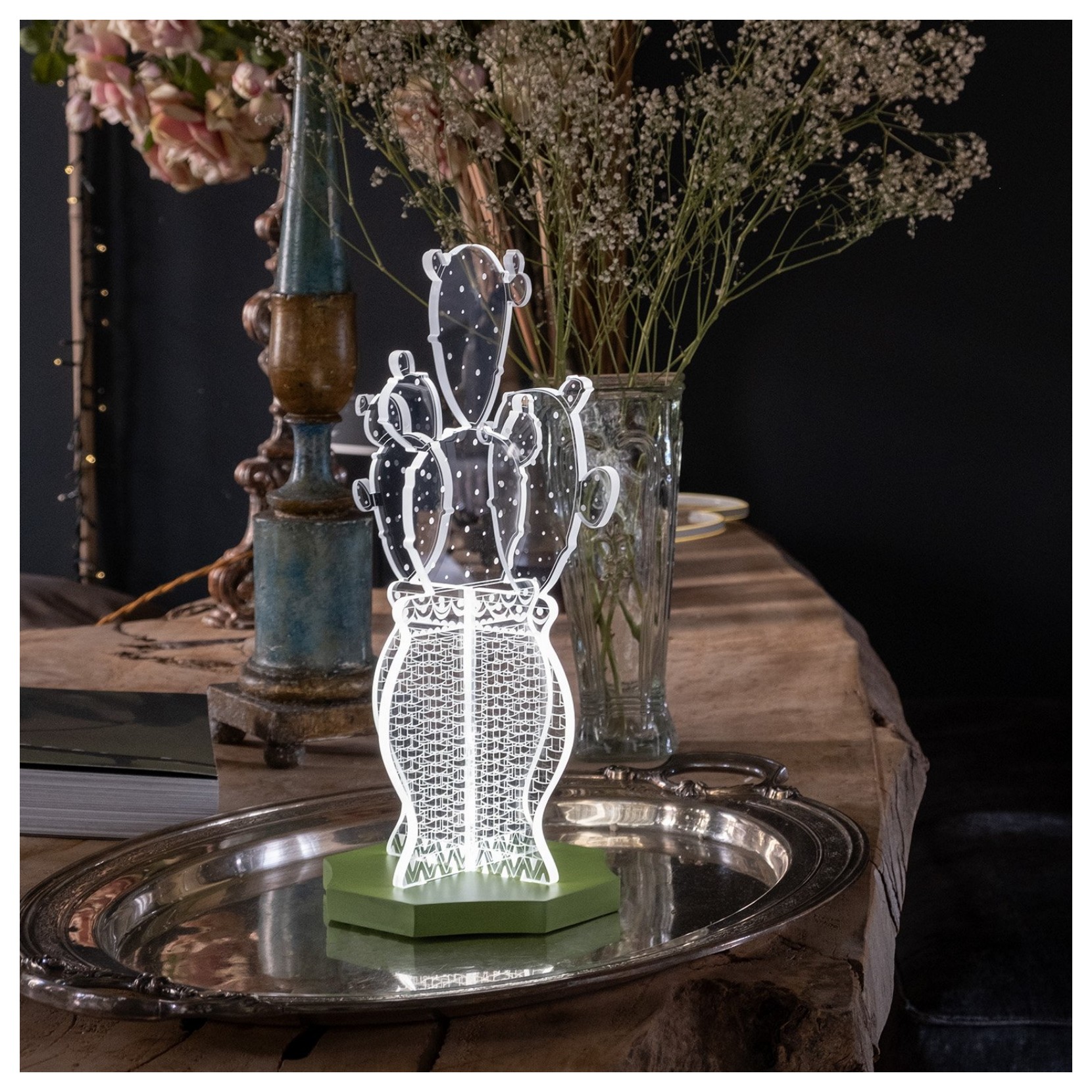 La lampe de table OSTUNI rappelle la tradition méridionale avec ce design piquant. La lampe en cristal acrylique transparent, avec des motifs gravés au laser qui diffusent la lumière de manière uniforme, le tout repose sur une base colorée qui parvient à donner une touche particulière.