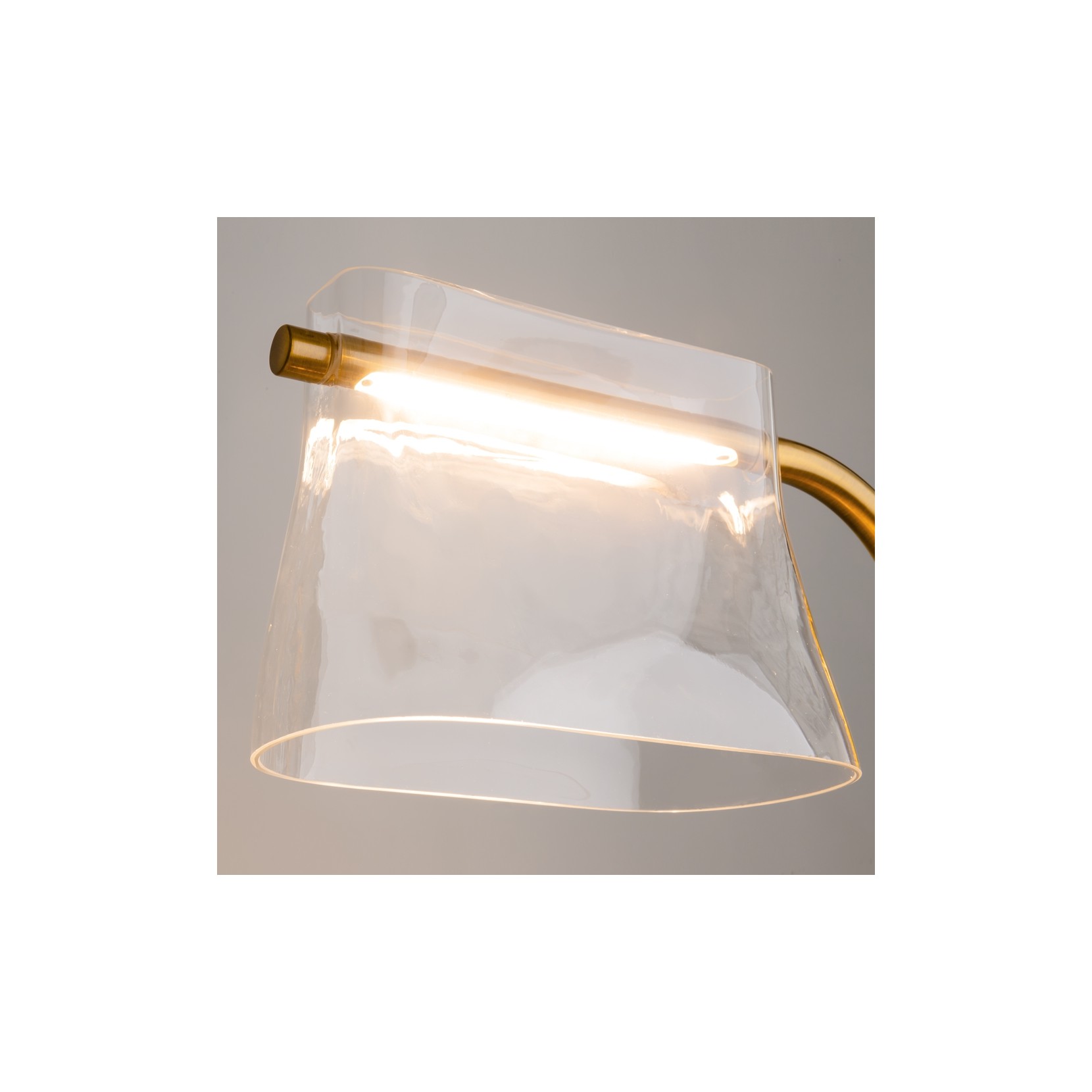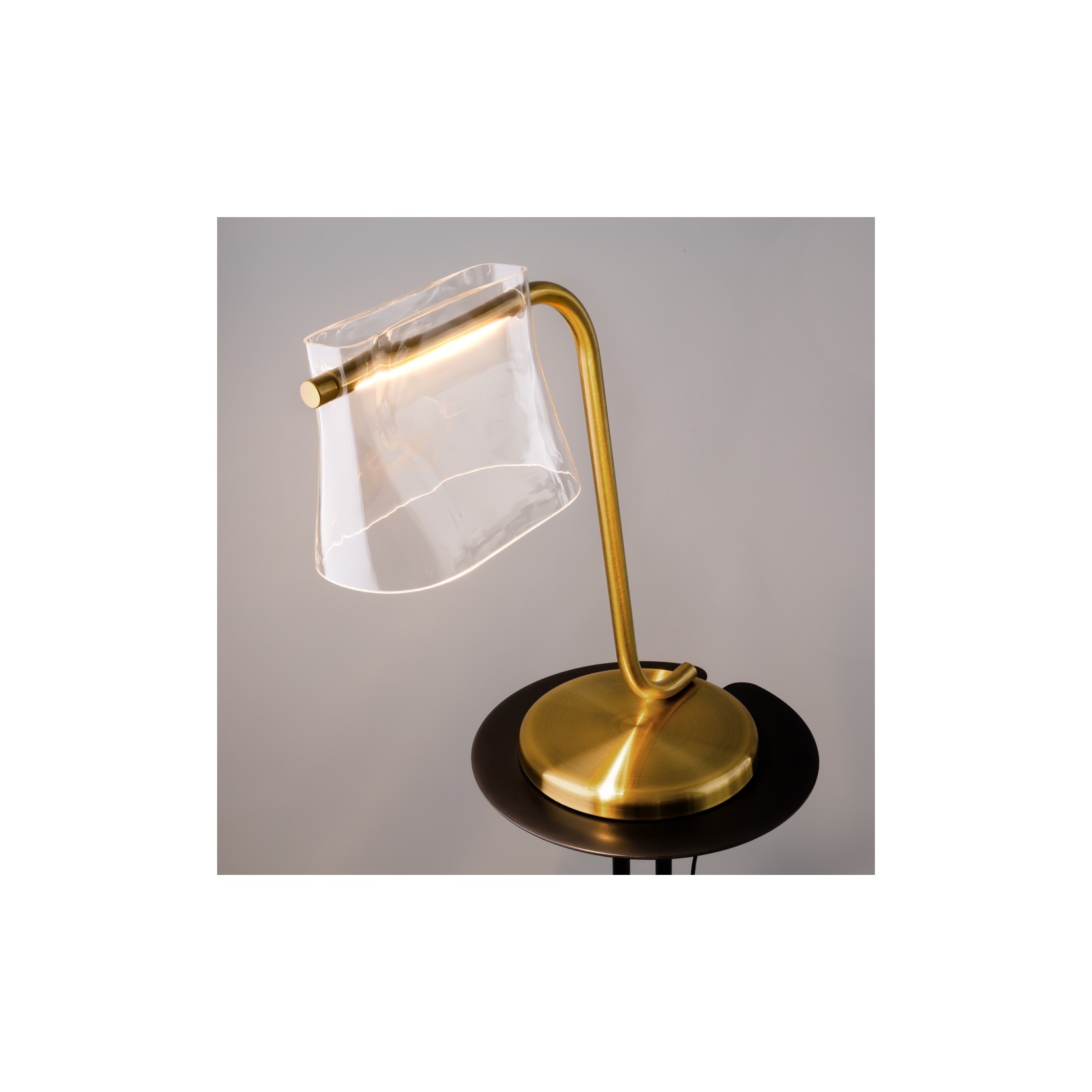 Les bases métalliques, sinueuses et raffinées, rappellent la mode scénique, tandis que les abat-jours en verre transparent évoquent légèreté et fluidité.