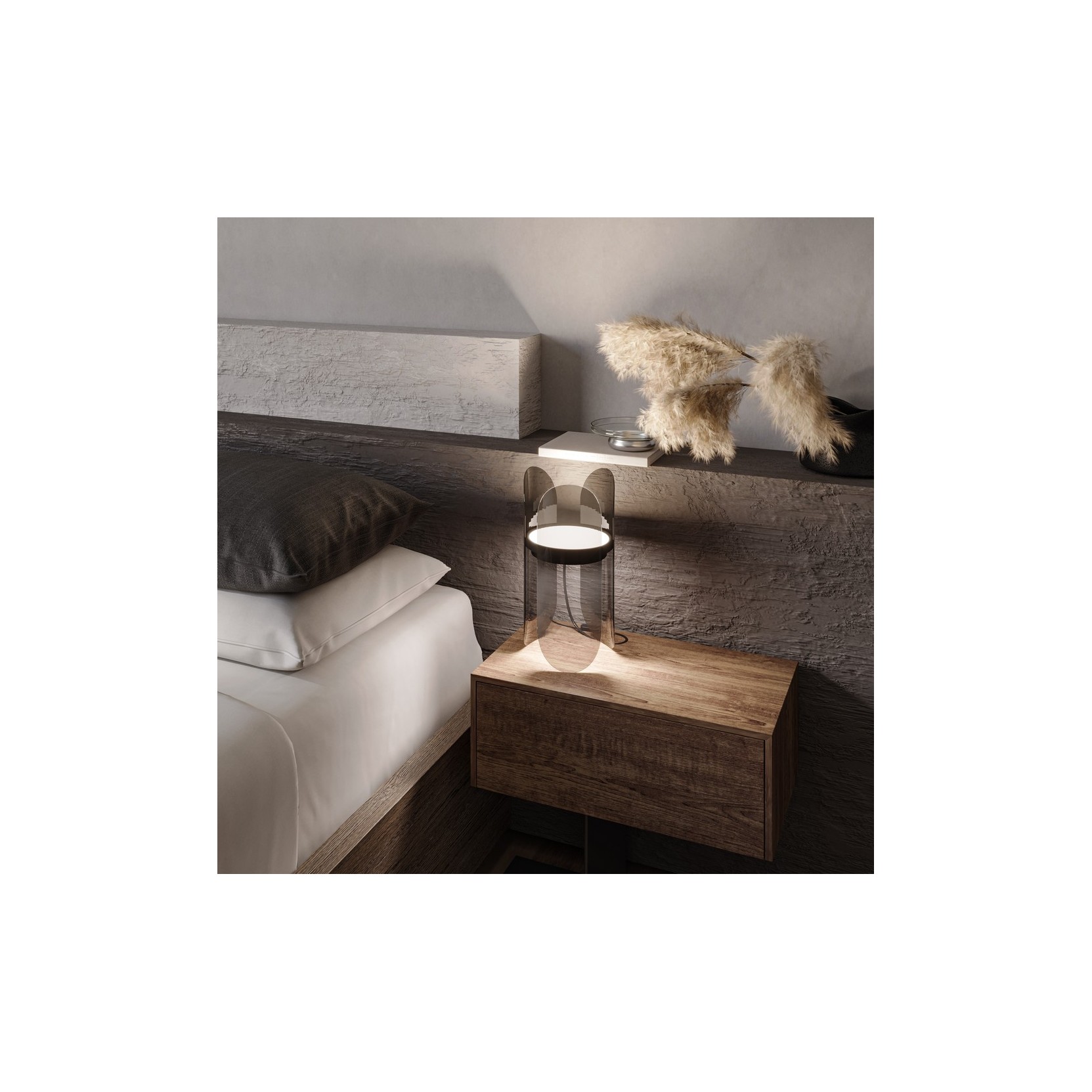 La lampe Insight se distingue par son corps composé de trois larges panneaux verticaux en polycarbonate ou verre acrylique fumé, en forme de pétales. Ces « ailes » transparentes enveloppent le noyau lumineux central, créant un effet de stratification visuelle qui rappelle l'éclosion d'une fleur de nuit. La teinte gris fumé du diffuseur apporte non seulement une touche de mystère, mais adoucit également l'émission lumineuse, transformant la lampe en une source de lumière d'ambiance idéale per les espaces lounge et modernes.