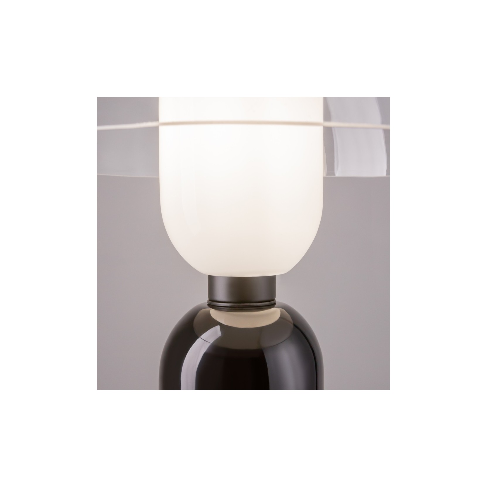 La lampe Memory se distingue par sa silhouette iconique basée sur un jeu de symétries et de volumes opposés. La structure se compose d'une base cylindrique solide en métal noir mat (ou céramique technique), de laquelle s'élève une tige fine soutenant deux diffuseurs hémisphériques en verre opalin blanc. Disposées de manière spéculaire, les deux calottes créent une forme de sablier stylisée qui diffuse la lumière harmonieusement vers le haut comme vers le bas.