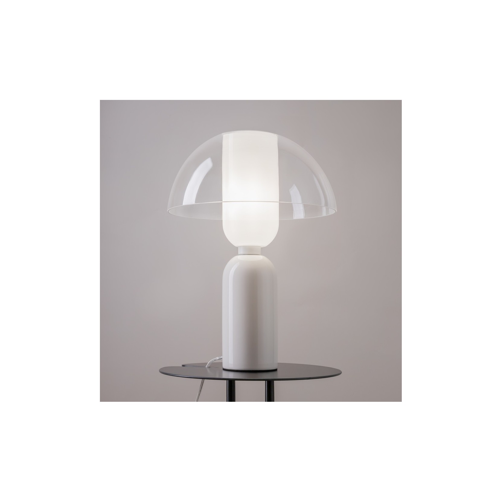 La lampe Memory se distingue par sa silhouette iconique basée sur un jeu de symétries et de volumes opposés. La structure se compose d'une base cylindrique solide en métal noir mat (ou céramique technique), de laquelle s'élève une tige fine soutenant deux diffuseurs hémisphériques en verre opalin blanc. Disposées de manière spéculaire, les deux calottes créent une forme de sablier stylisée qui diffuse la lumière harmonieusement vers le haut comme vers le bas.