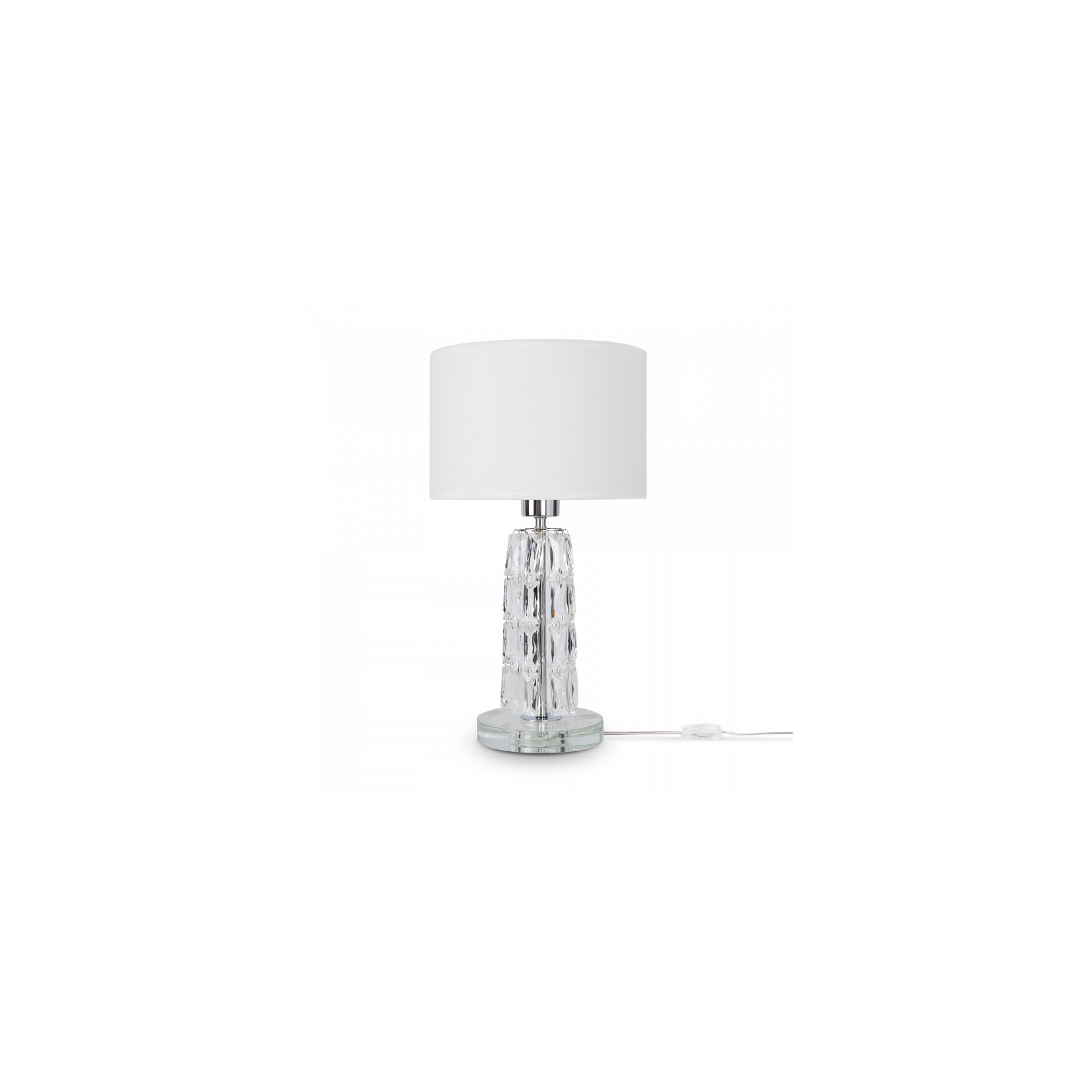 La lampe de table TALENTO se compose dune structure en métal chromé avec des éléments en verre, les diffuseurs en PVC sont recouverts de tissu blanc. La lampe convient aux environnements classiques et contemporains.