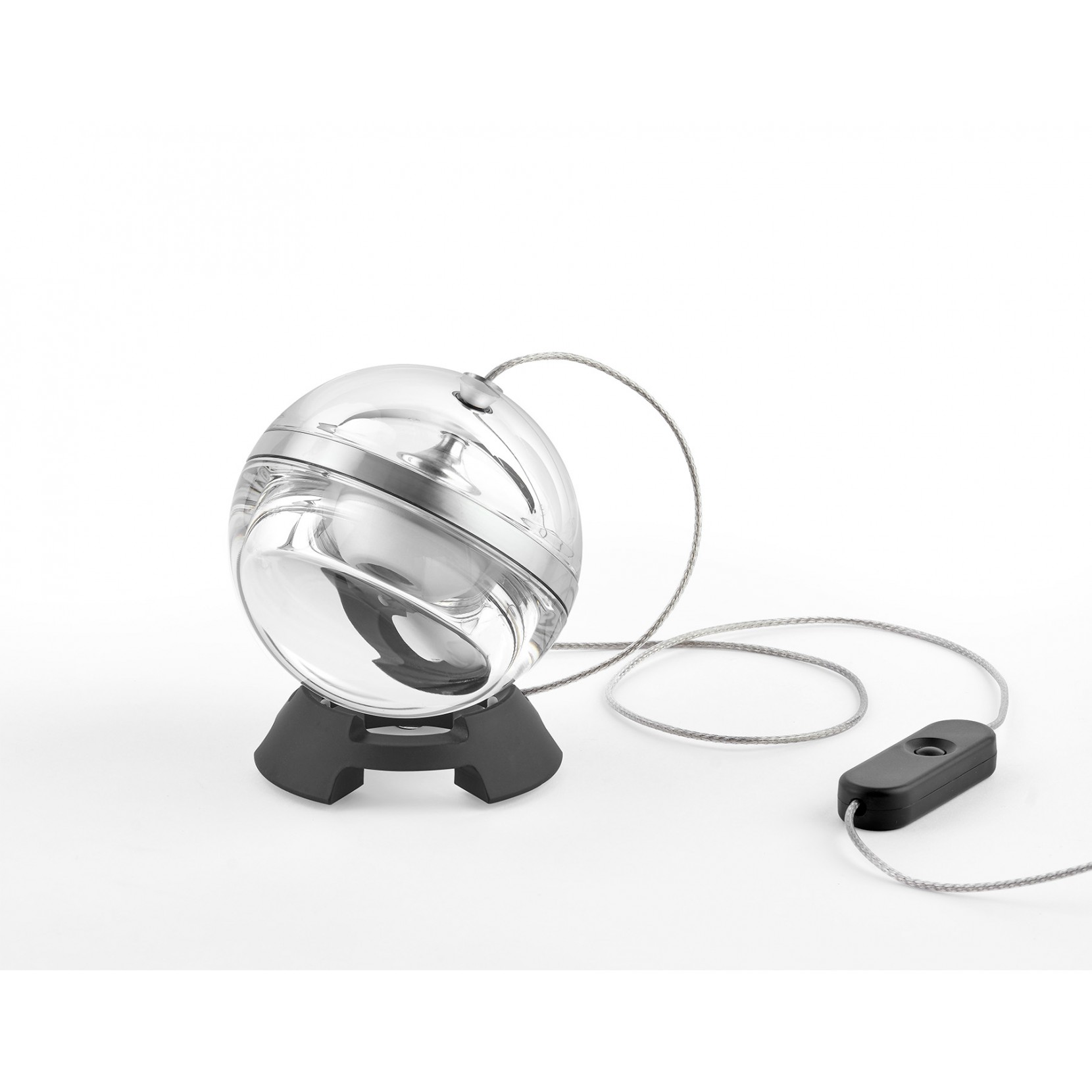 La lampe de table LIMBUS EYE se compose d’une structure en aluminium en trois finitions différentes : aluminium naturel, noir et laiton; entourée de cristal transparent, donnant à la lampe un aspect d’impact à la fois allumé et éteint.