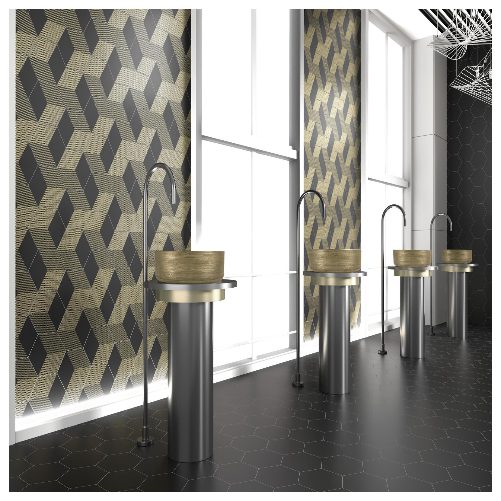Un lavabo raffiné en porcelaine avec intérieur brillant blanc et finition extérieure dorée mate, caractérisé par des rainures délicates qui réfléchissent et modulent la lumière.