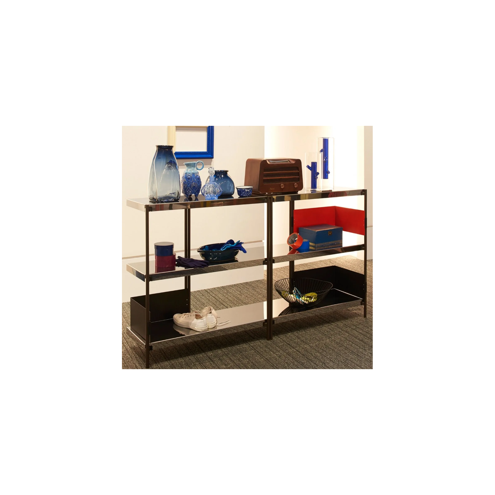 Zigzag est une bibliothèque aux formes simples conçue par Konstantin Grcic. Les étagères et la structure sont en acier inoxydable poli miroir. Il est possible dajouter des serre-livres en tôle dacier laqué époxy dans les couleurs blanc, noir, orange fluo, bronze et acier inoxydable poli miroir (pack de quatre).