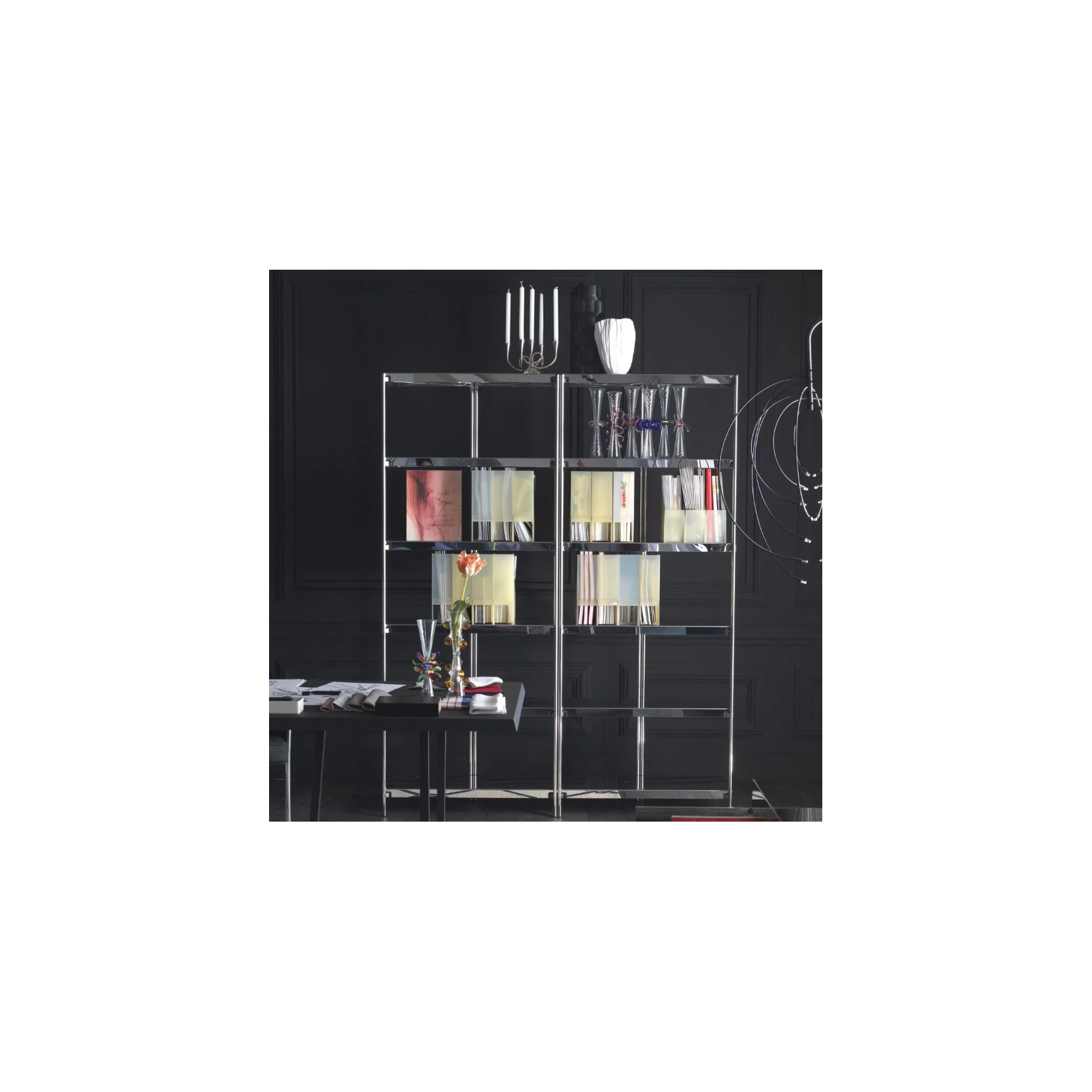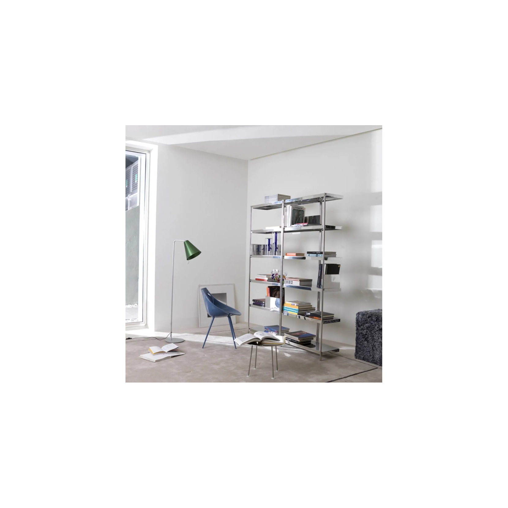 Zigzag est une bibliothèque aux formes simples conçue par Konstantin Grcic. Les étagères et la structure sont en acier inoxydable poli miroir. Il est possible dajouter des serre-livres en tôle dacier laqué époxy dans les couleurs blanc, noir, orange fluo, bronze et acier inoxydable poli miroir (pack de quatre).