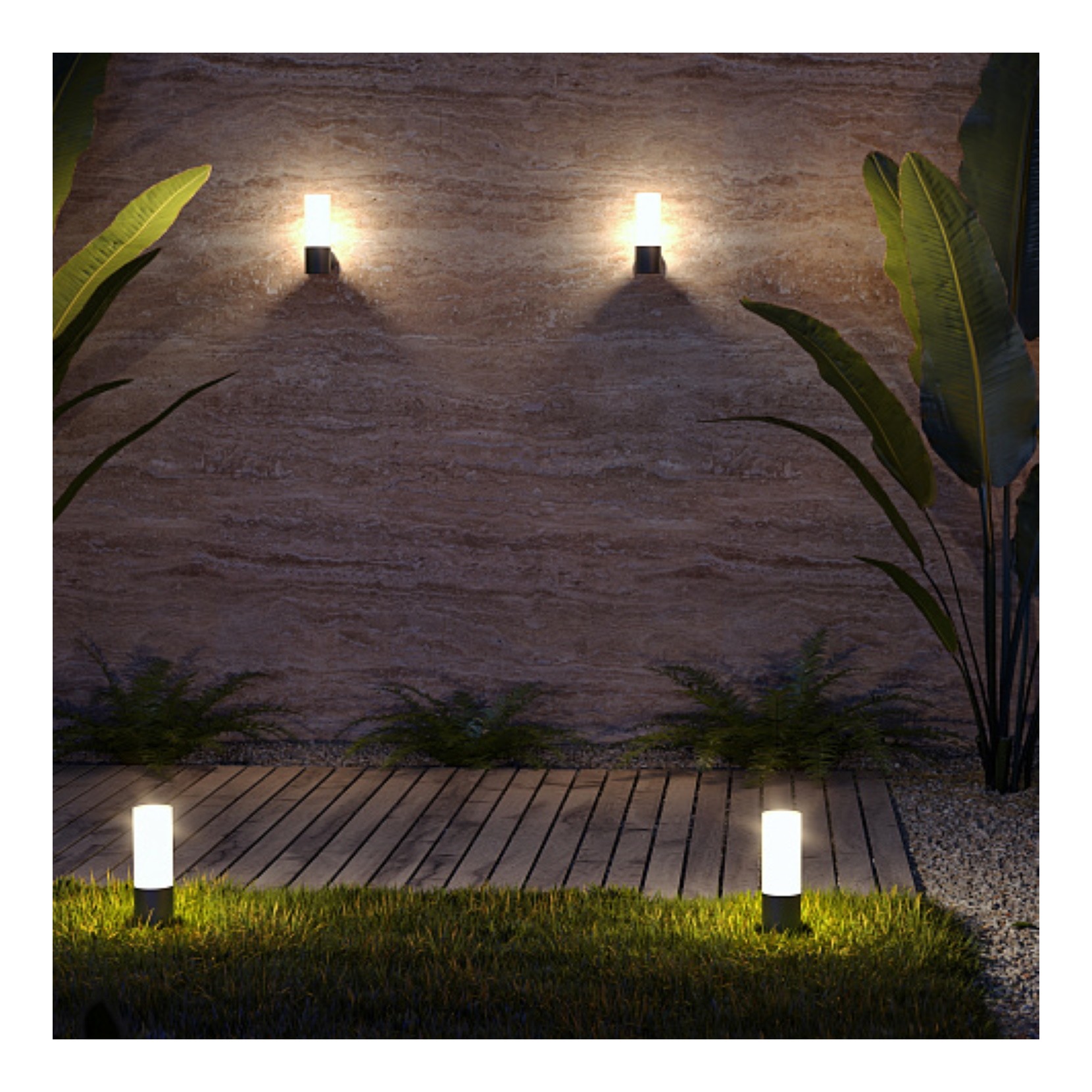 La lampe murale extérieure WILLIS a un design conçu pour sadapter aux différents styles de votre maison. La structure en métal est dans la finition noire ou grise avec diffuseur cylindrique blanc.