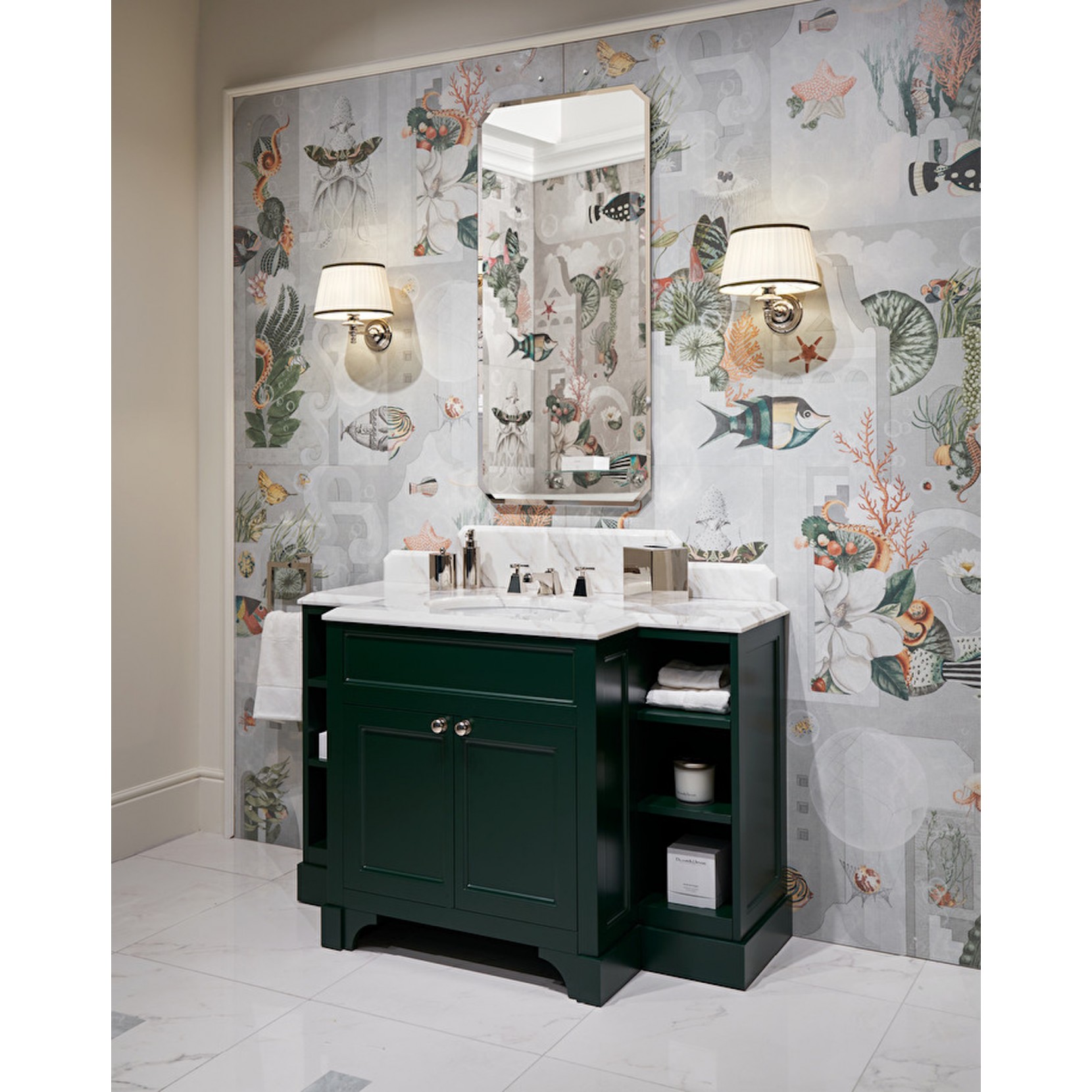 The undisputed elegance of FLAIR is distinguished by its outstanding timeless design. The lacquered wood structure available in different finishes of colour ( Dark Grey, Off White, Warm Grey, English green) is composed of a top ( Bianco Carrara, Nero Marquinha, Calacatta Borghini) and raised in marble with brass knobs.