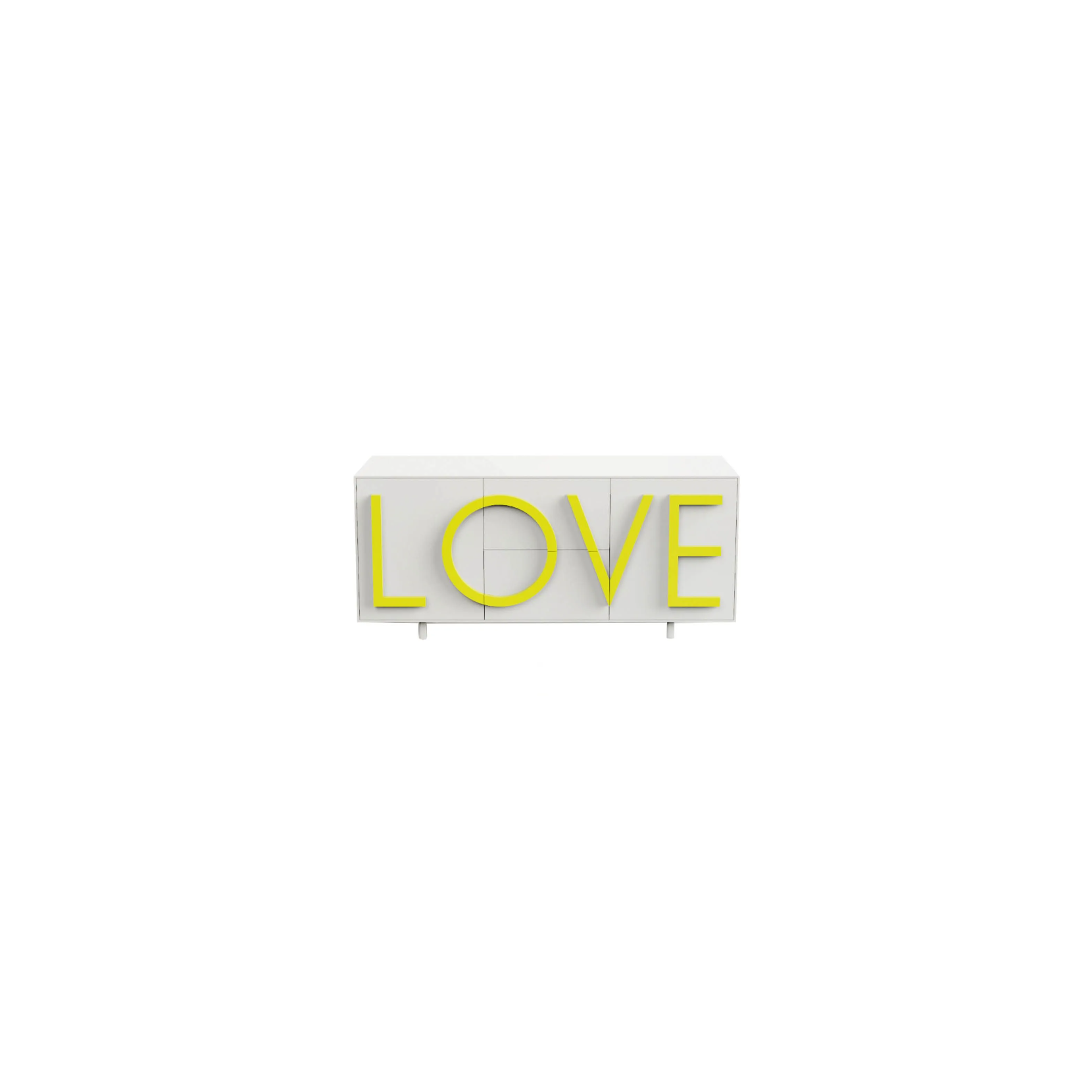 LOVE est un conteneur en MDF laqué blanc avec deux portes latérales à battant et étagère interne amovible, avec deux commodes centrales à extraction totale. Structure en MDF laqué extérieurement et intérieurement. Inscription LOVE en relief avec fonction de poignée en MDF laqué. Pieds cylindriques réglables diamètre 3,5 cm. et hauteur 10 cm. de la même couleur que la structure. Usage intérieur uniquement.