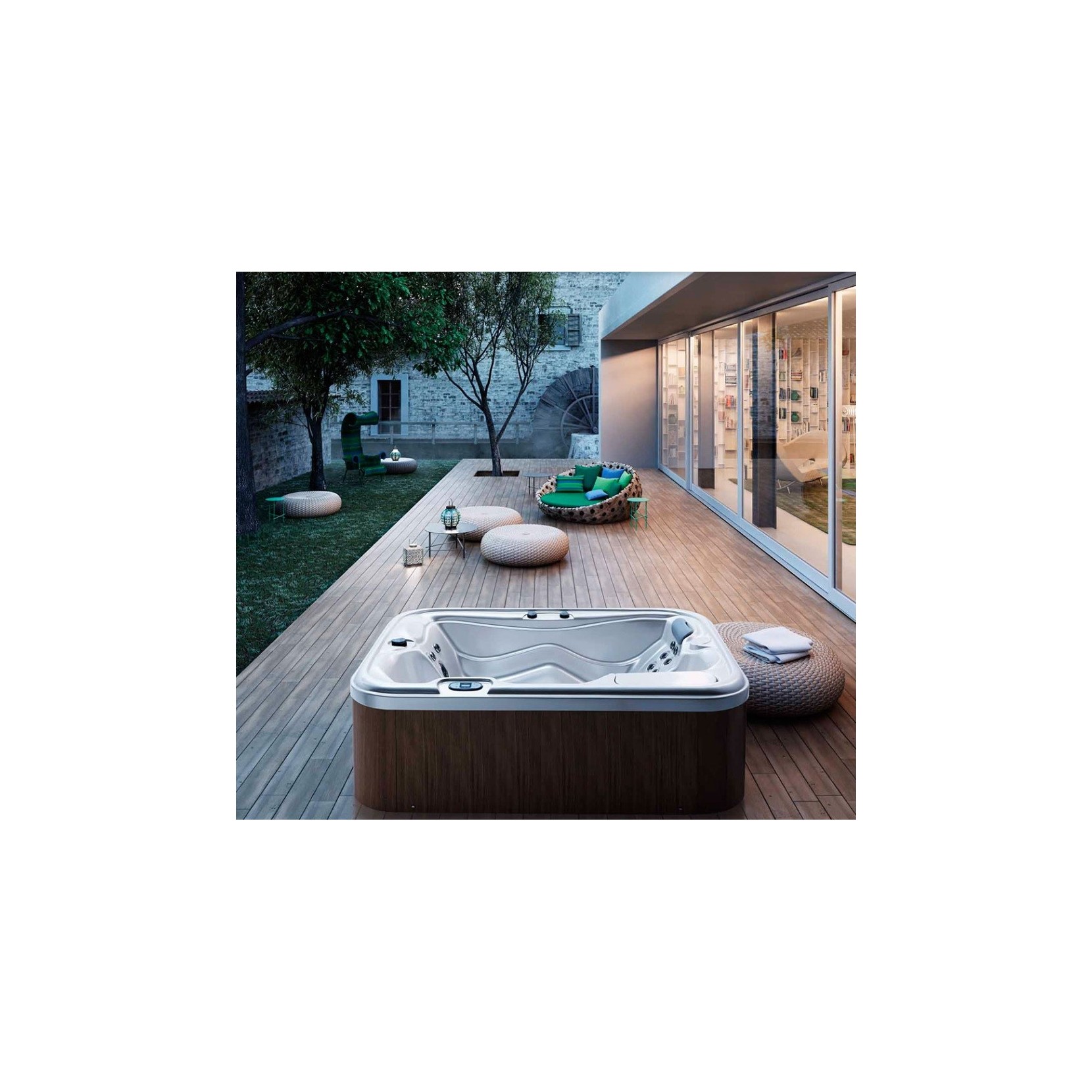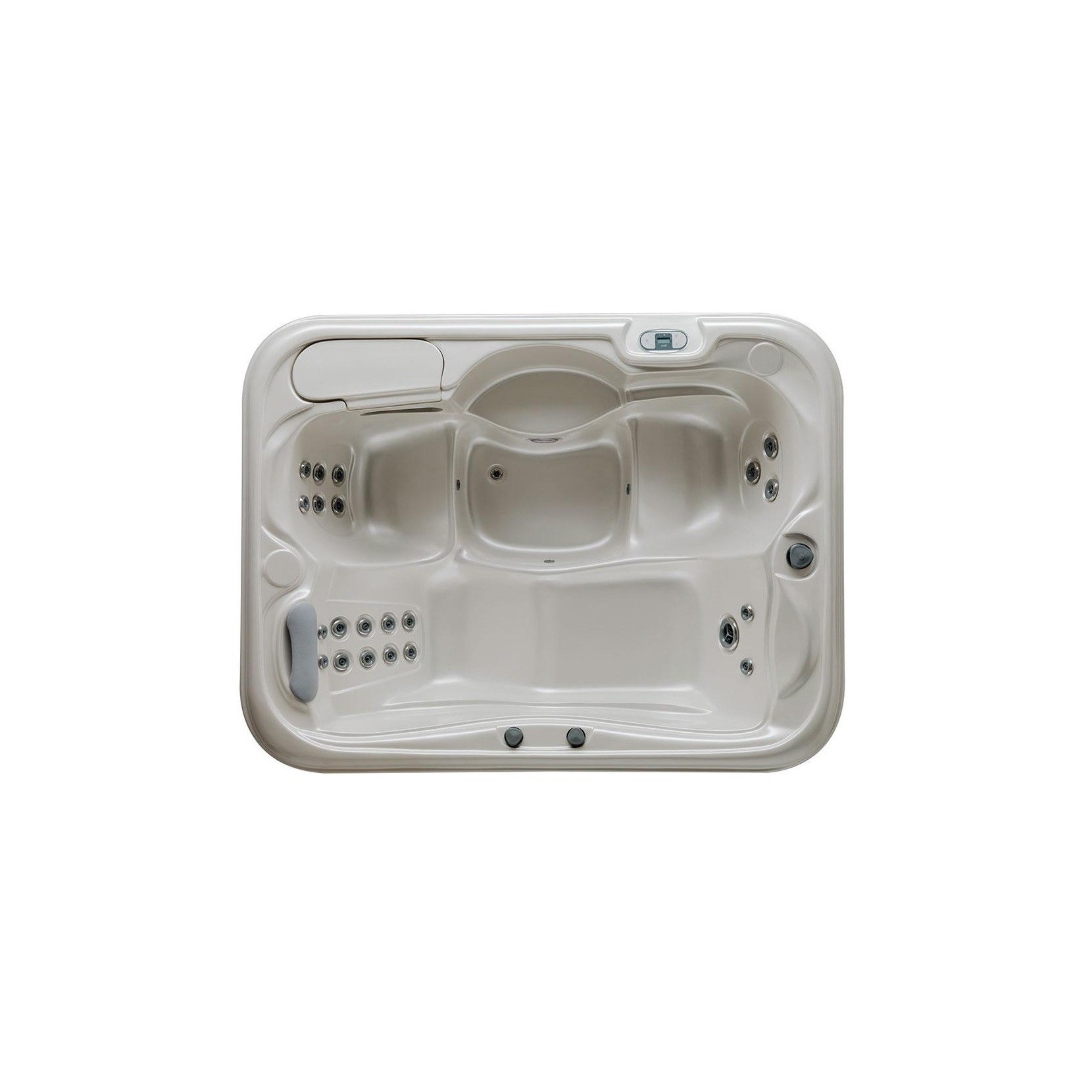 22 hydro jets, chromothérapie, réchauffeur (3kW), pompe 1 vitesse (3 hP), pompe de recirculation, filtre à cartouche (15m²), ozonateur, appuie-tête