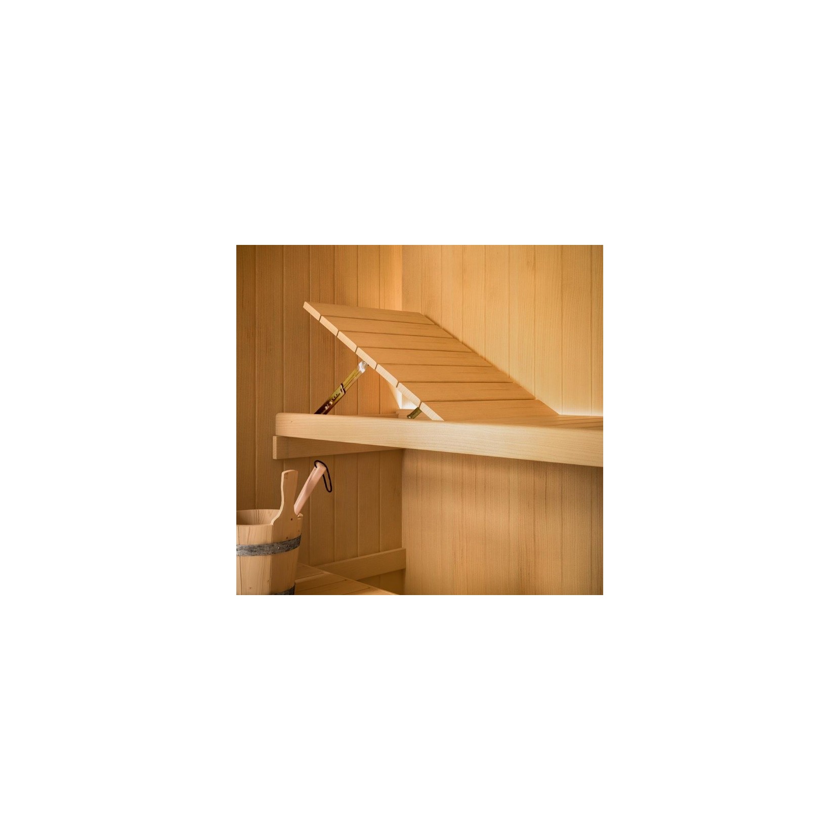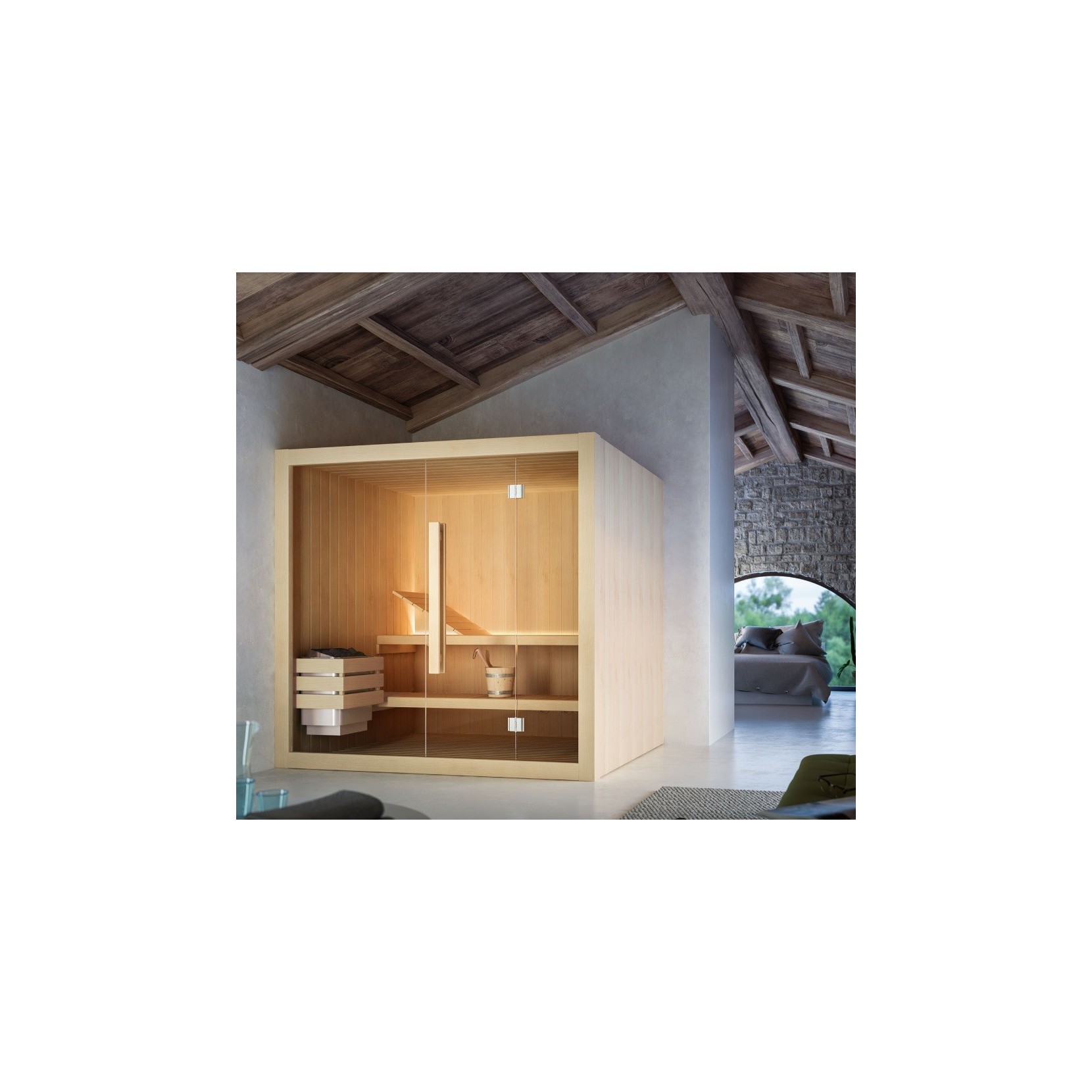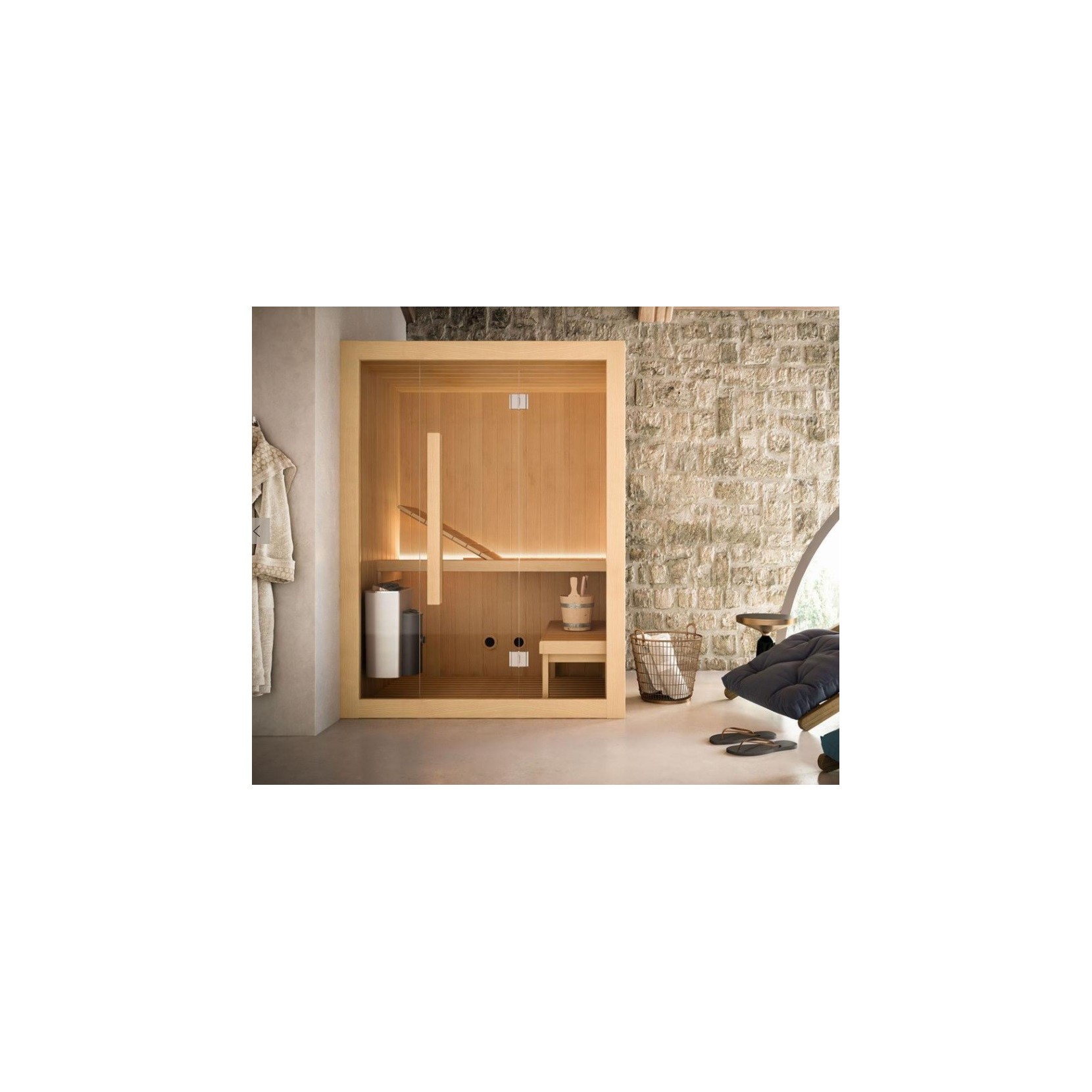 Hoshi est un sauna avec extérieur et intérieur en Hemlock. Sont inclus : poêle avec commandes intégrées, pierres et couvercles en bois dépoli, banc supérieur et inférieur avec appuie-tête inclinable intégré, marchepieds au sol, sablier, hygromètre, thermomètre. Porte battante avec verre trempé transparent de 8mm, charnières chromées, poignée intérieure/extérieure en bois.