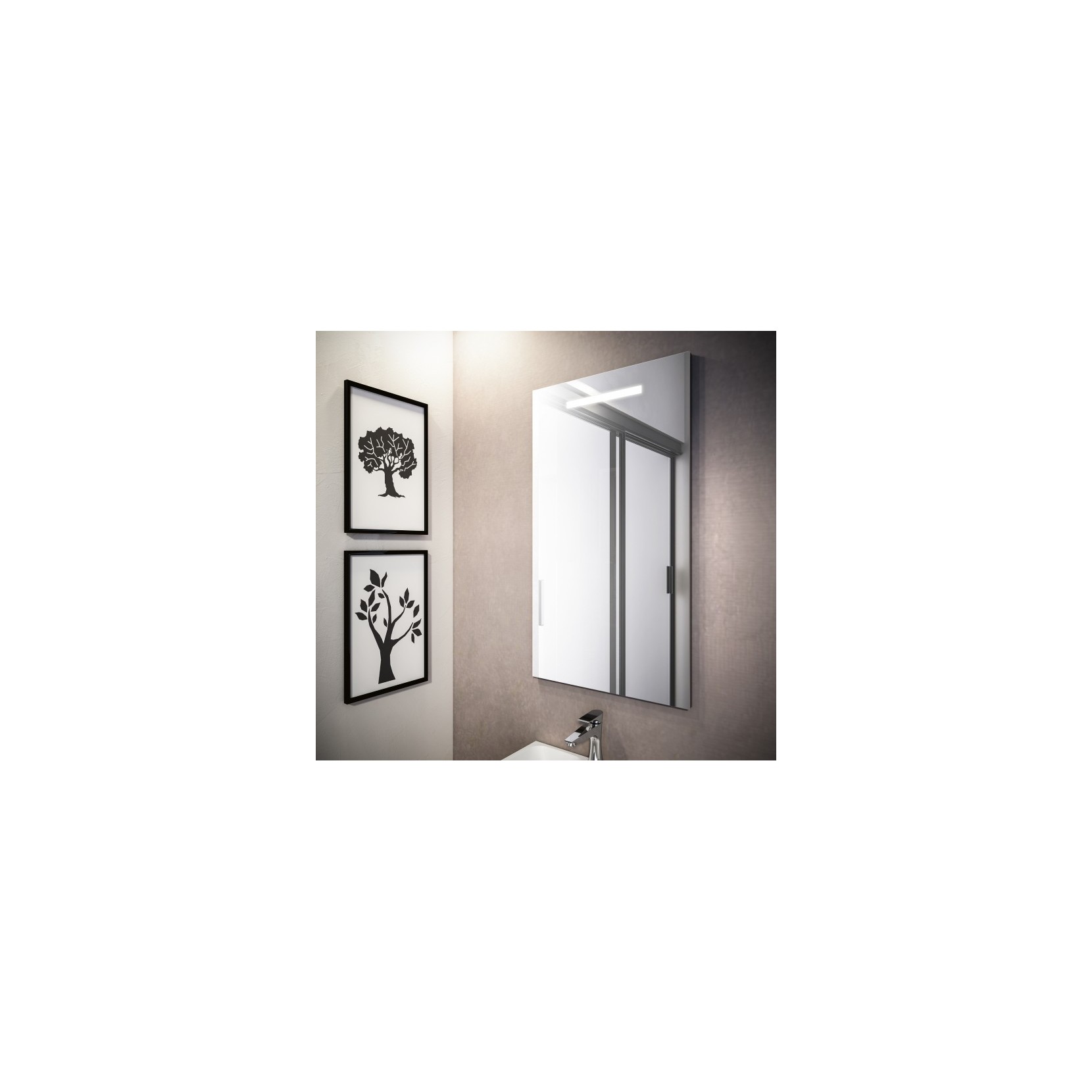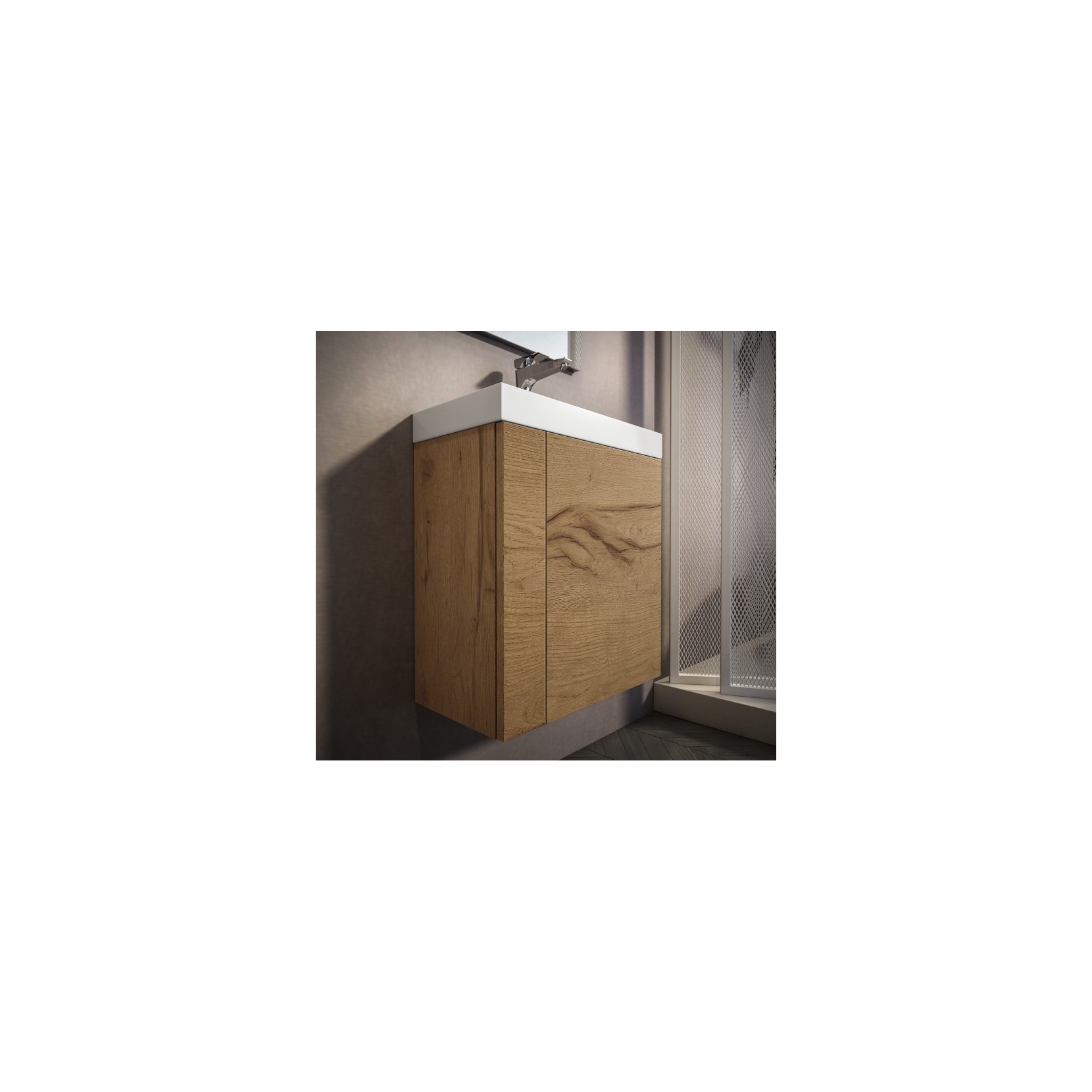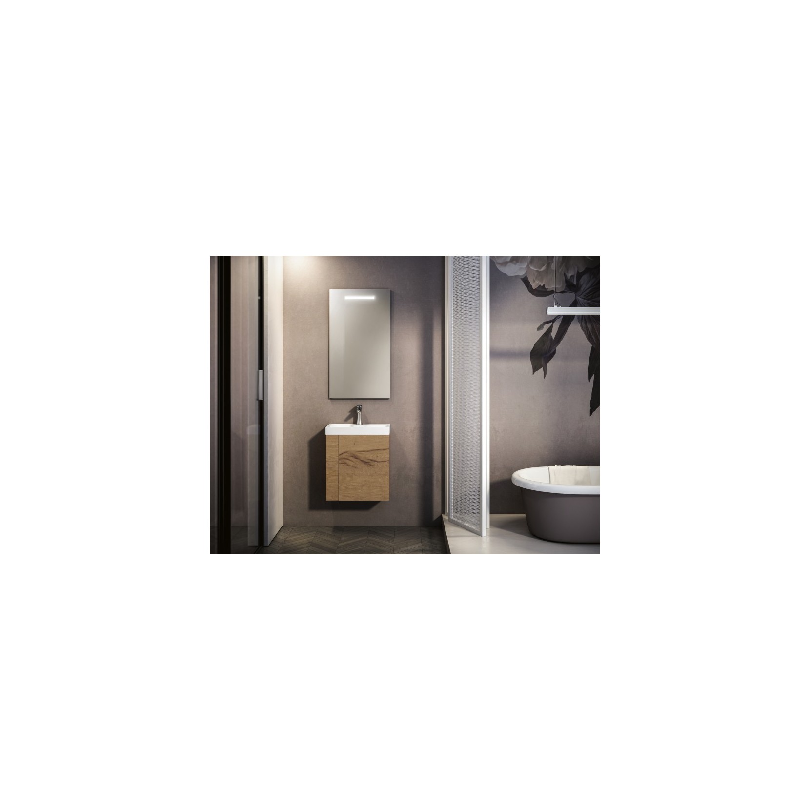 Meuble sous-vasque en finition bois 961 Nativo Cotto avec ouverture push-pull et vasque en Tecnolux blanc. Miroir Nobi avec éclairage LED