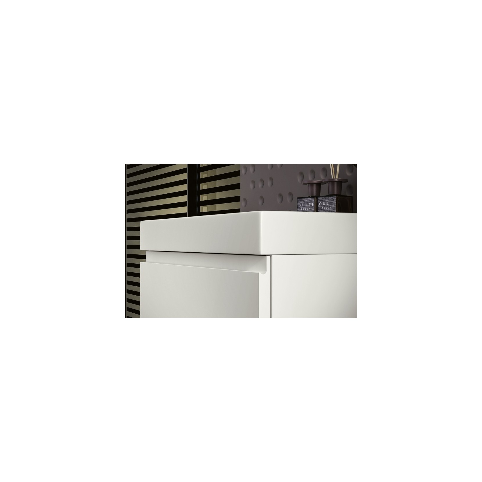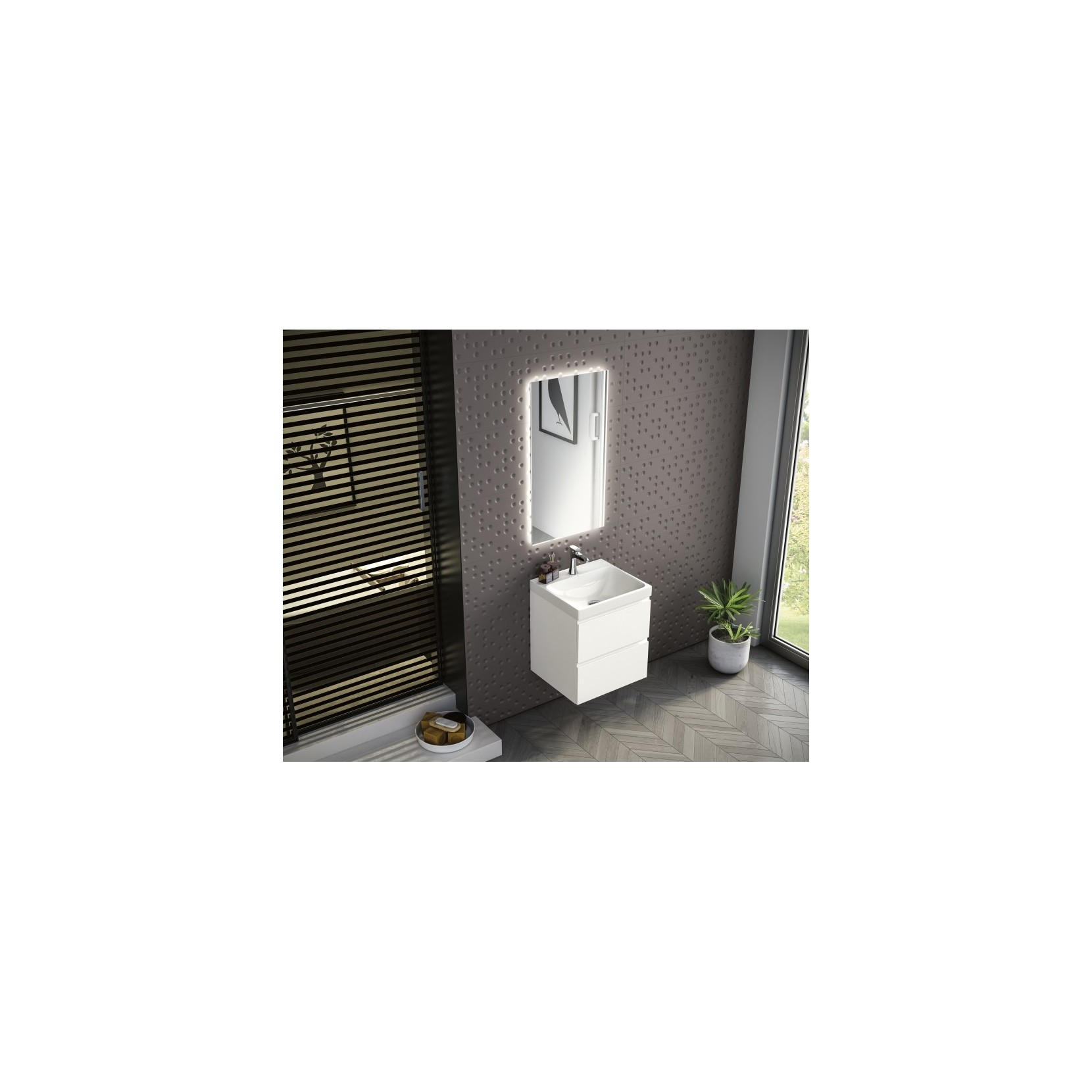 Meuble sous-vasque en laqué 017 Latte brillant avec prise de main; plan en Tecnolux blanc. Miroir Eden rétro-éclairé avec éclairage LED.