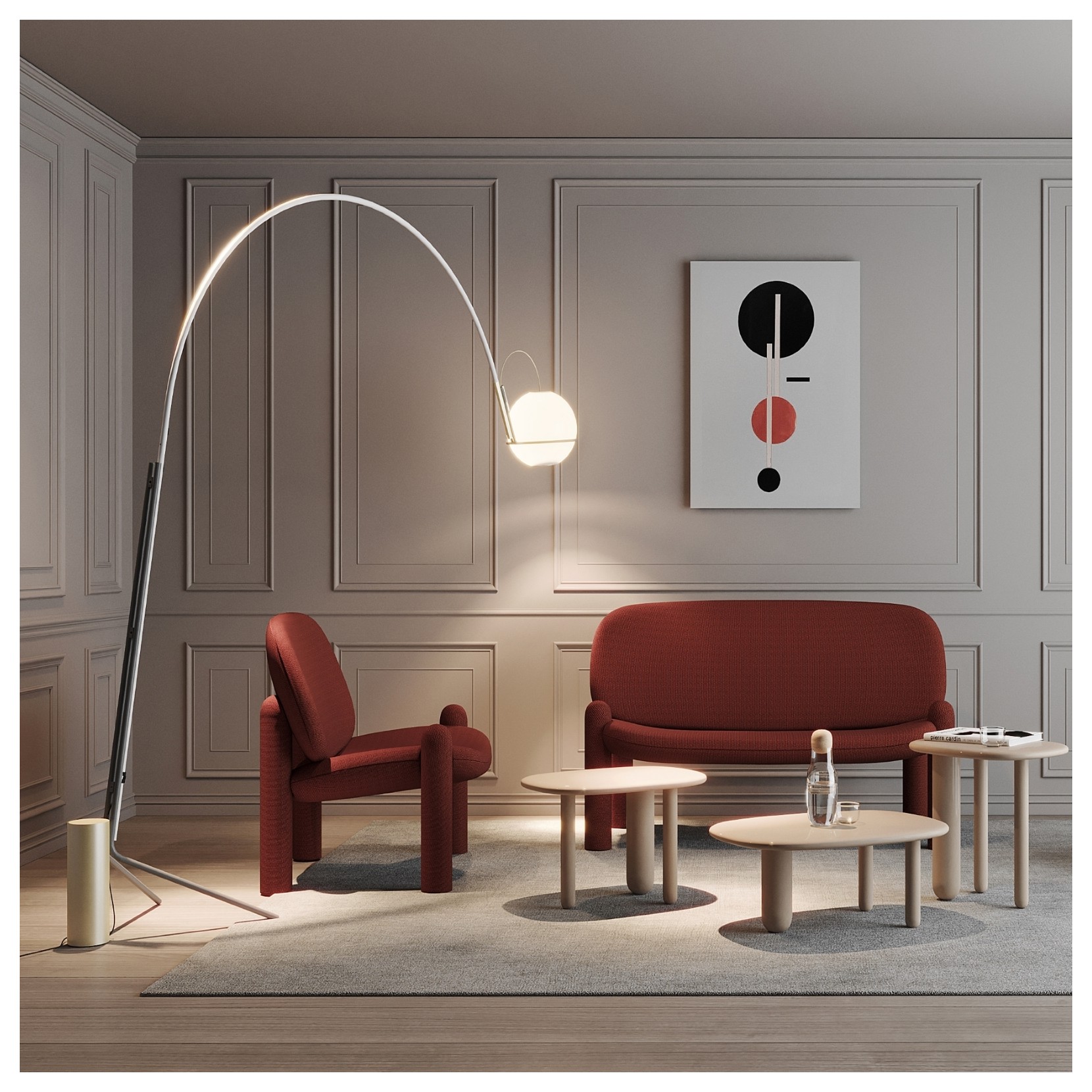 Structure en polyuréthane flexible à densité moyenne, pieds en PE pour L’appui au sol. Le revêtement est fixe en tissu et en cuir. Utilisation uniquement à l’intérieur.