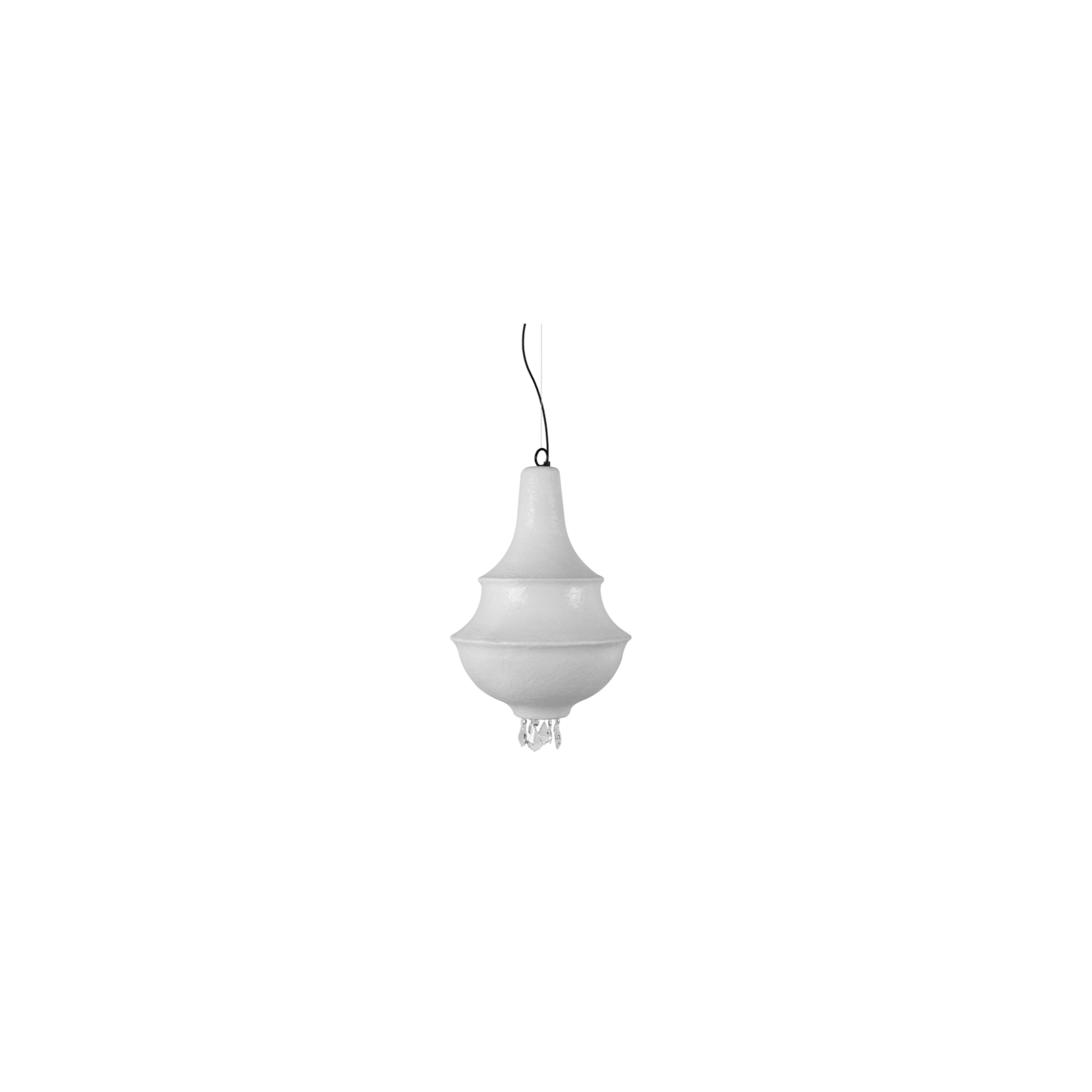 Lady D est un élégant lampadaire conçu par Matteo Ugolini; Le corps en fibre de verre blanche améliore ses formes délicates. Nous trouvons Lady D dans la version suspendue, doù pendent des gouttes de cristal, et dans la version au sol qui se présente sans pendentifs mais équipée dun anneau en haut qui permet de la déplacer facilement.