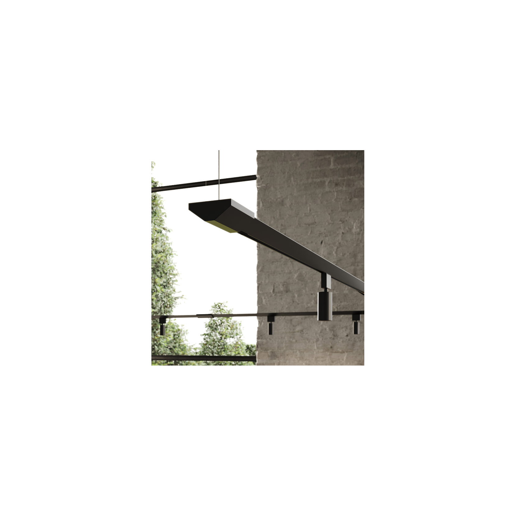 Une structure en aluminium suspendue et modulable, grâce aux joints angulaires et linéaires, et un système coulissant qui permet d’insérer les projecteurs par le bas. La lampe Turn It, grâce à sa modularité, permet de composer et de configurer la lumière selon chaque préférence ou exigence.