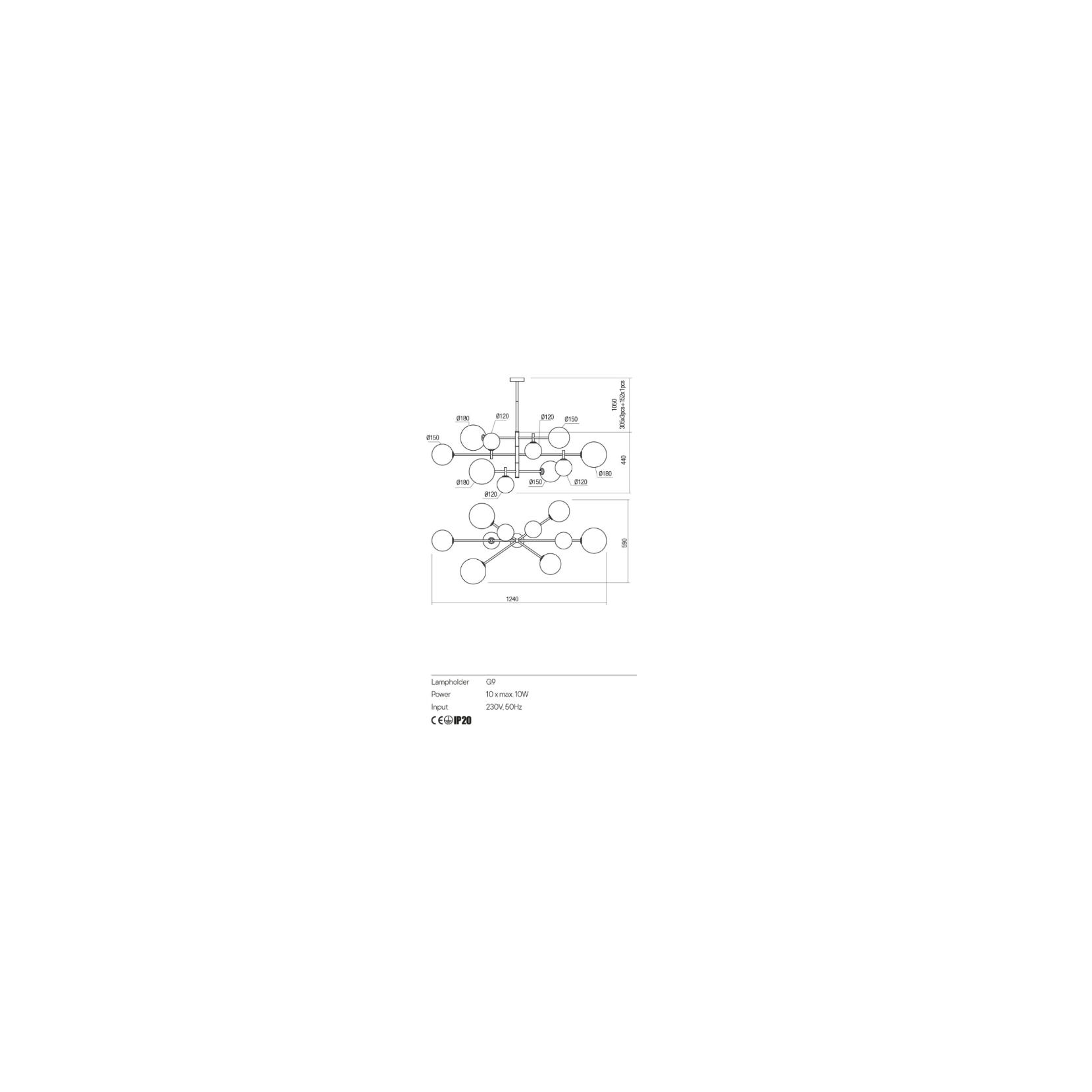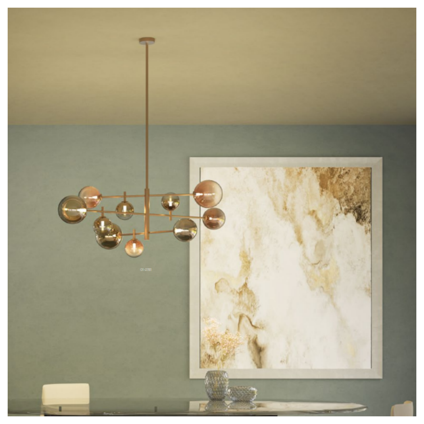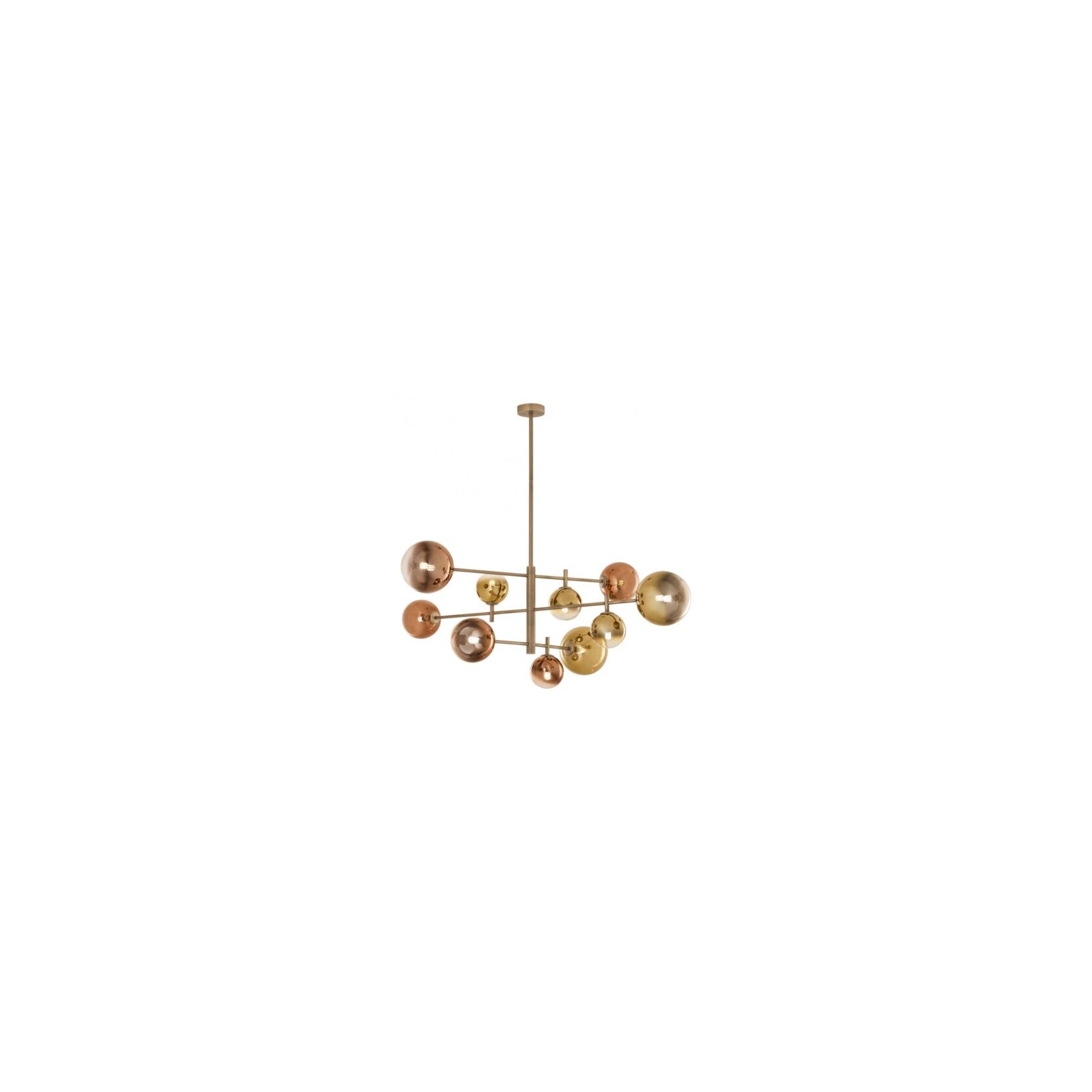 Le lamapda se présente avec une structure en métal finition laiton antique mat, diffuseur en verre pyrex avec finition dégradée en miroir or et café.