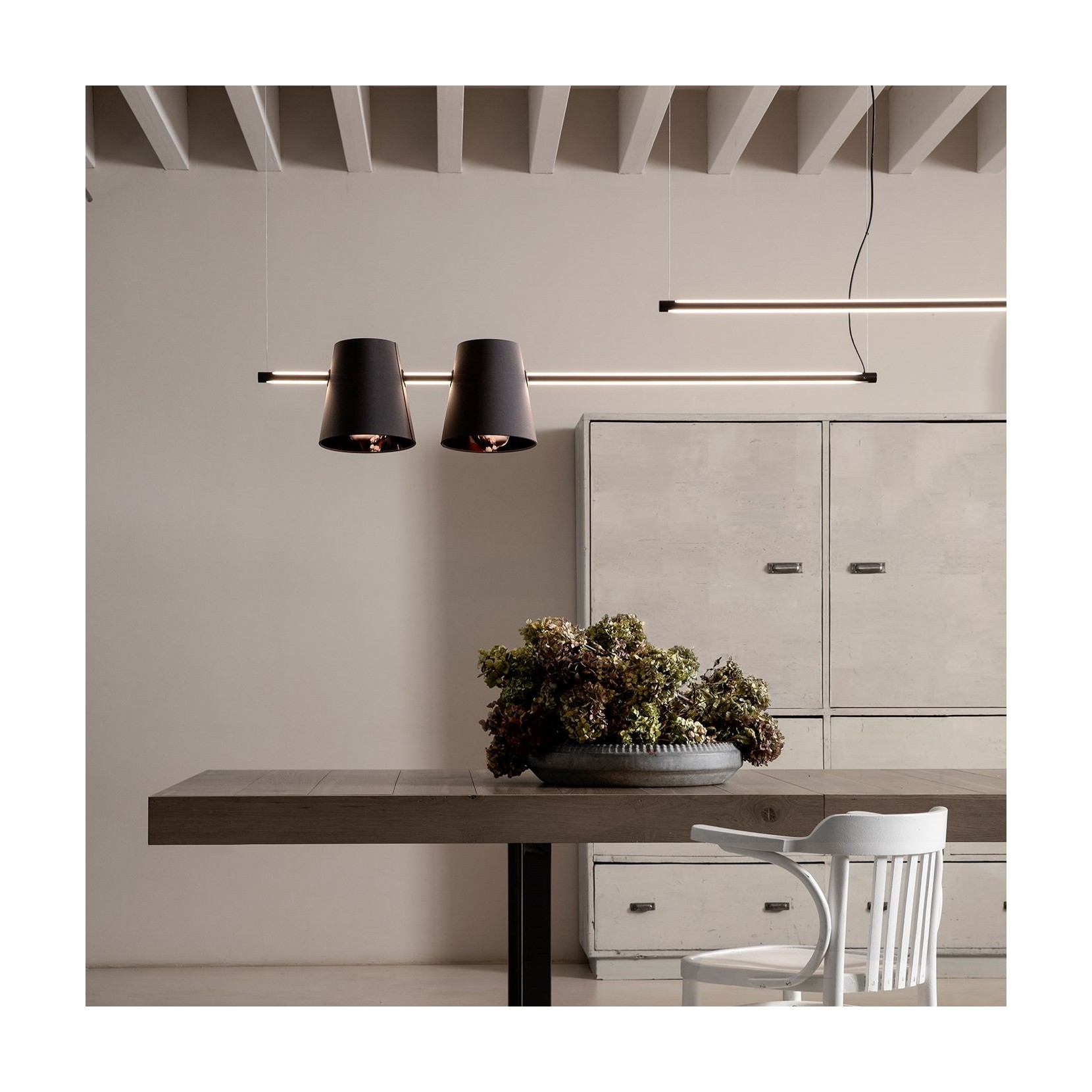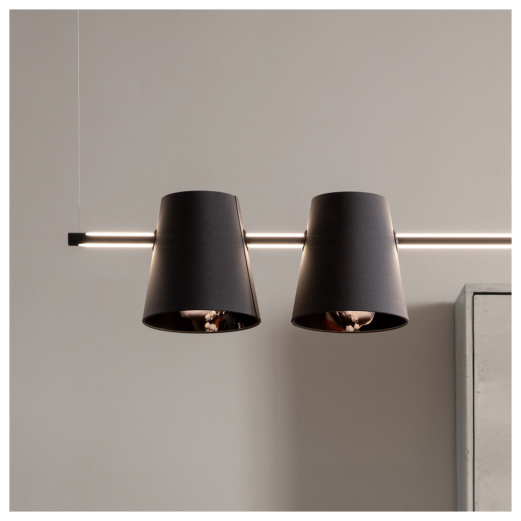 Une longue barre led en aluminium noir mat enrichie éventuellement d’un ou plusieurs abat-jour en tissu représentant des visages de geishe. Cupidon est une lampe à la lumière délicate et représente l’union entre l’Orient et l’Occident, le minimalisme et la tradition.