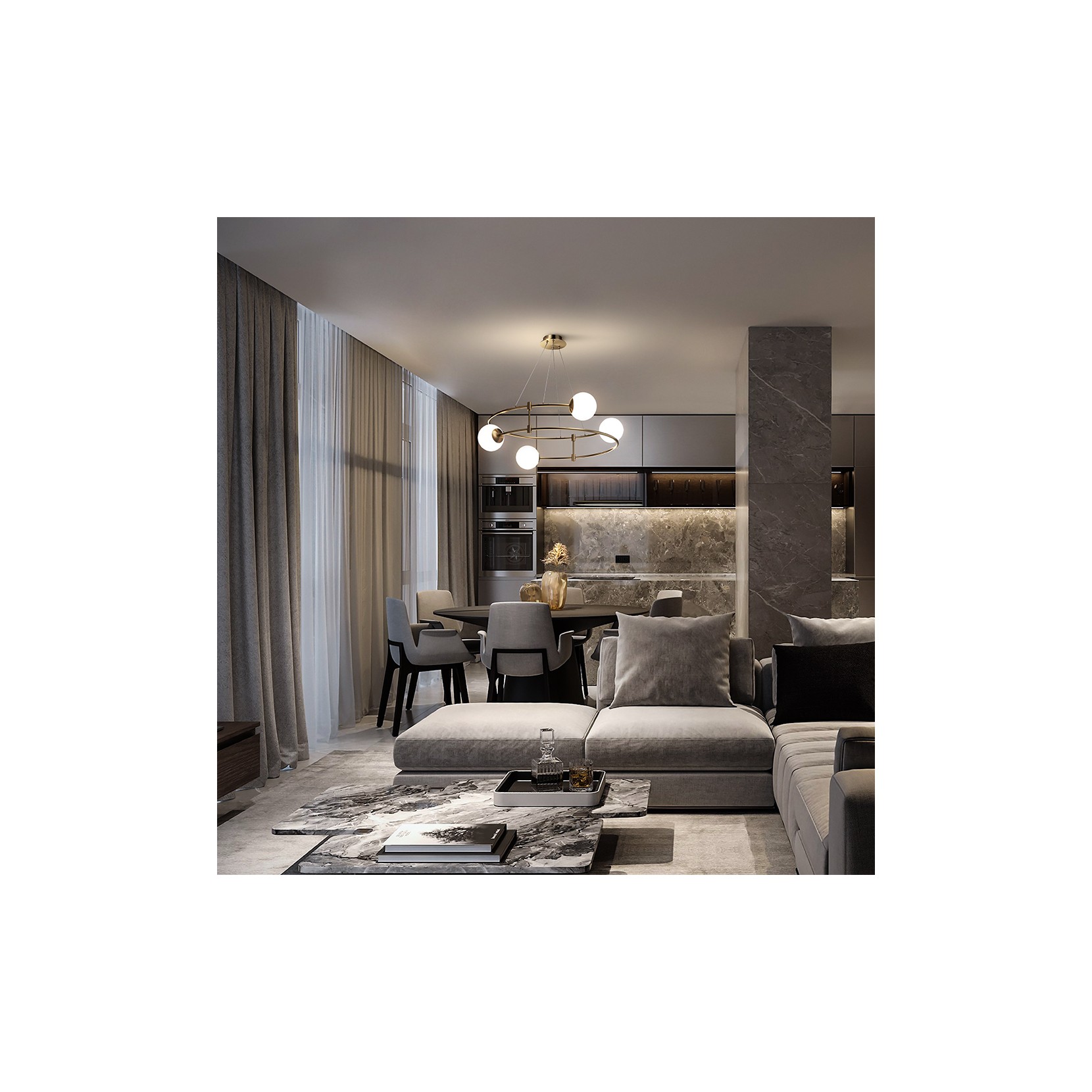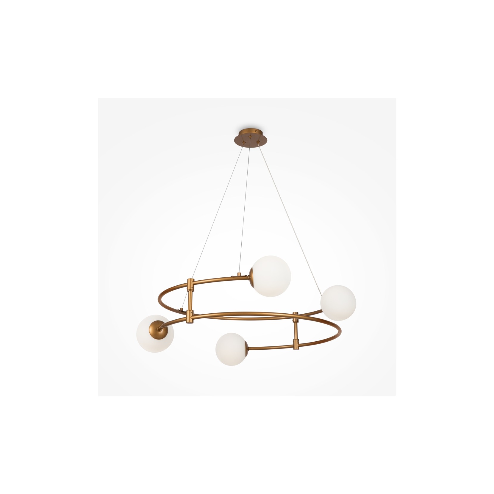 Les plafonniers, réalisés en verre soufflé mat, diffusent une lumière douce et agréable, créant une atmosphère chaleureuse et accueillante.