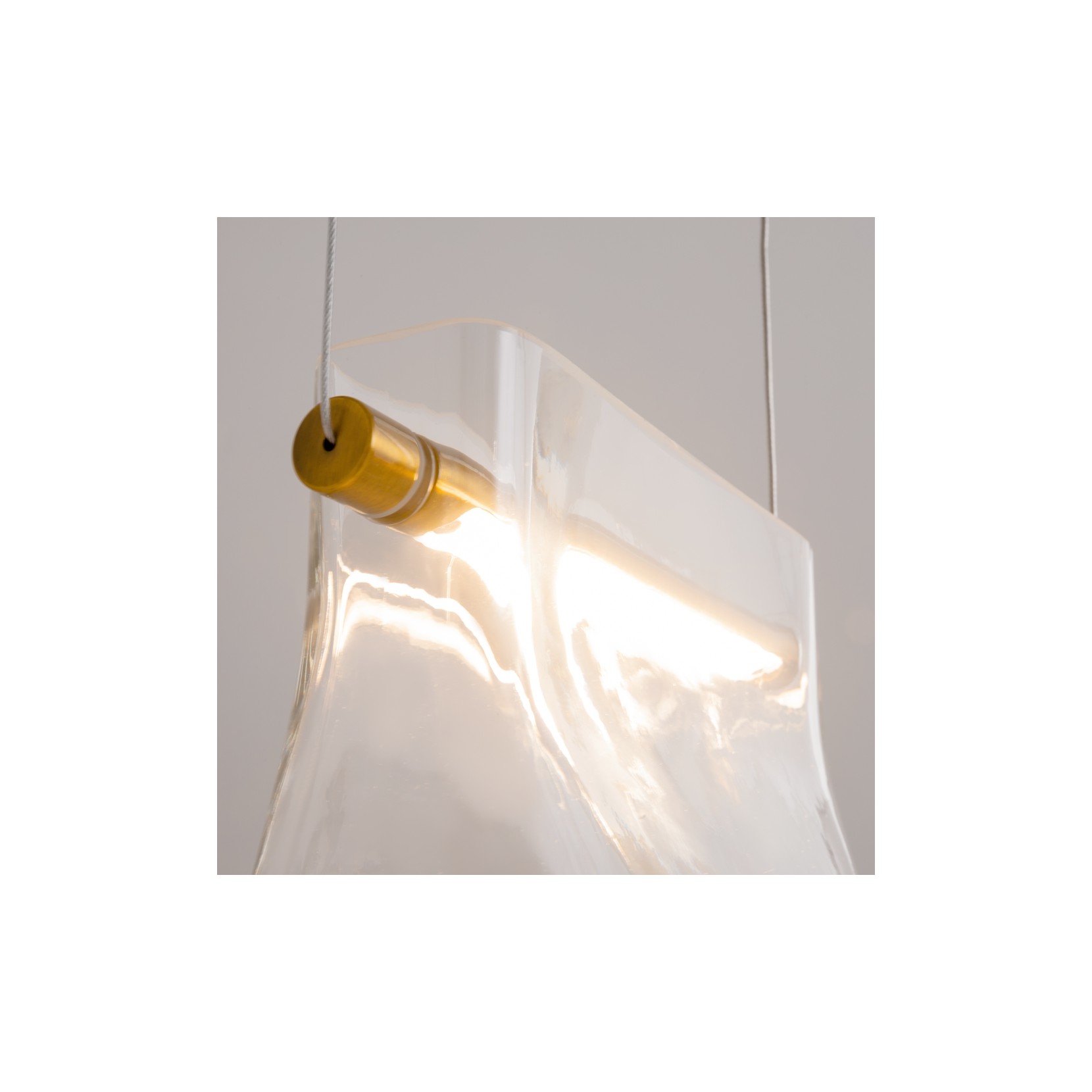 Les bases métalliques, sinueuses et raffinées, rappellent la mode scénique, tandis que les abat-jours en verre transparent évoquent légèreté et fluidité.