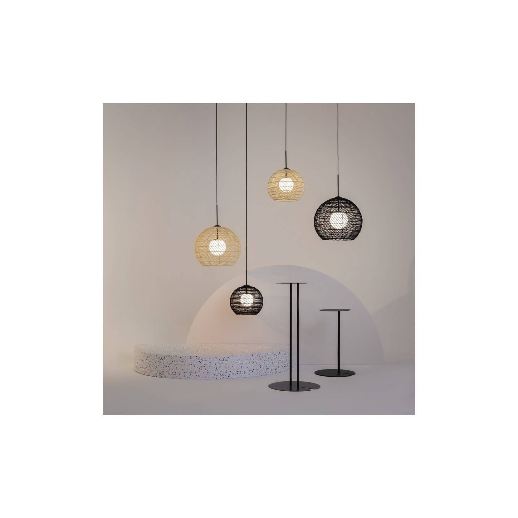 Les abat-jours sont en métal avec une finition noire et beige, tandis quà lintérieur se trouve une sphère blanche opaque qui sert de diffuseur, cachée par une ampoule avec un raccord G9.