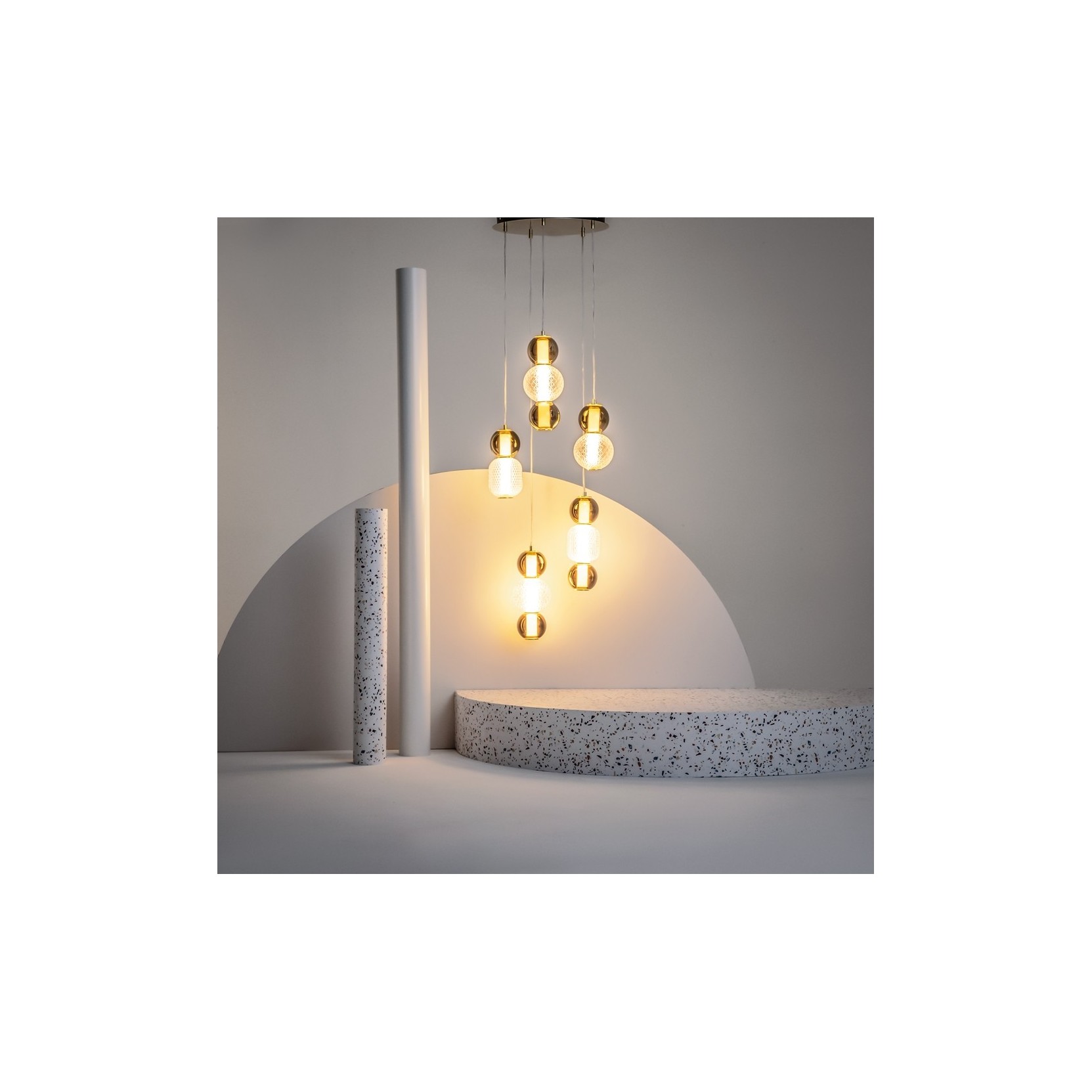 La suspension Drop est un exercice de style qui joue avec les transparences et les textures pour créer une atmosphère magnétique. Caractérisée par une composition verticale d'éléments géométriques en verre, cette lampe n'est pas seulement un luminaire, mais une sculpture suspendue qui ajoute une touche d'élégance sophistiquée à tout intérieur moderne.