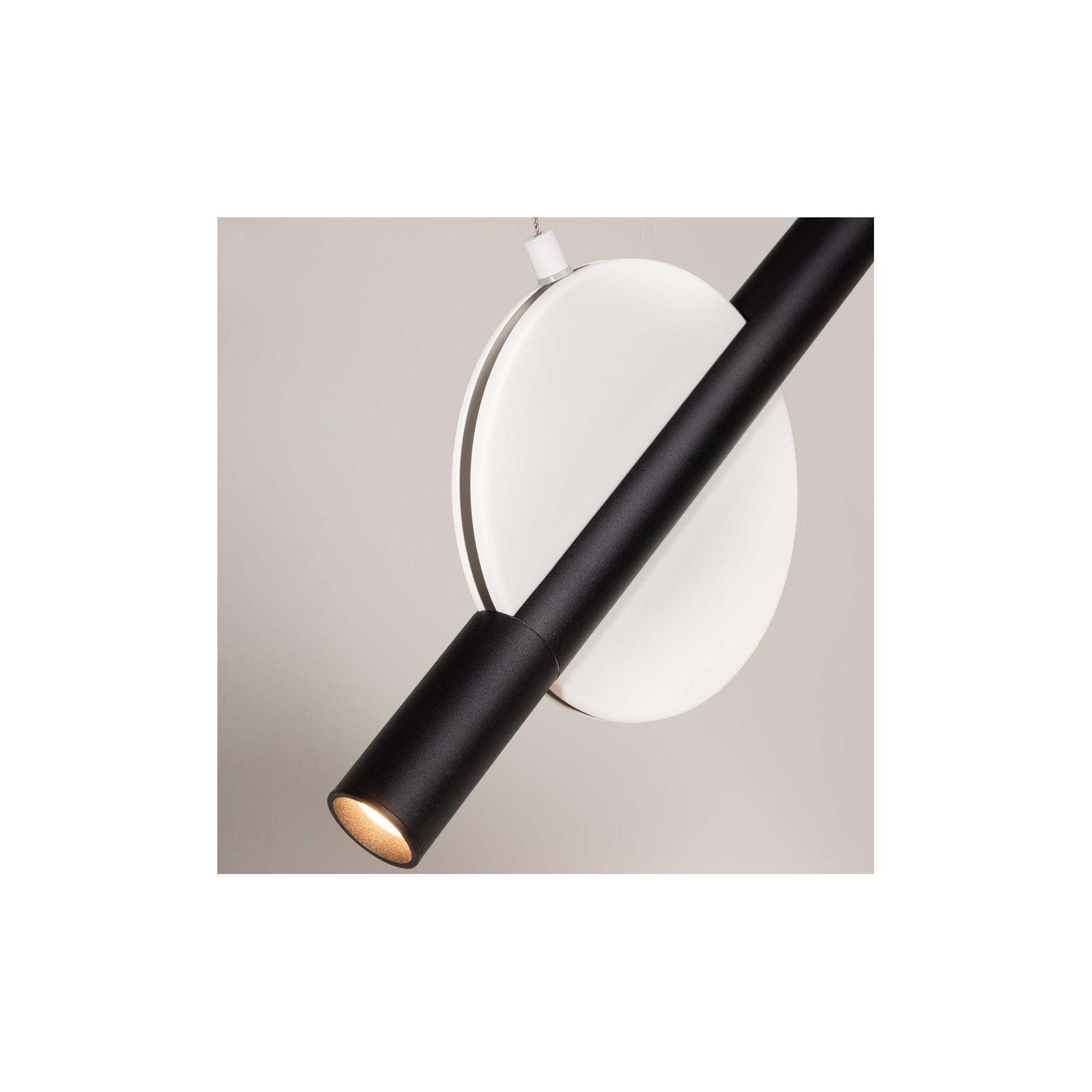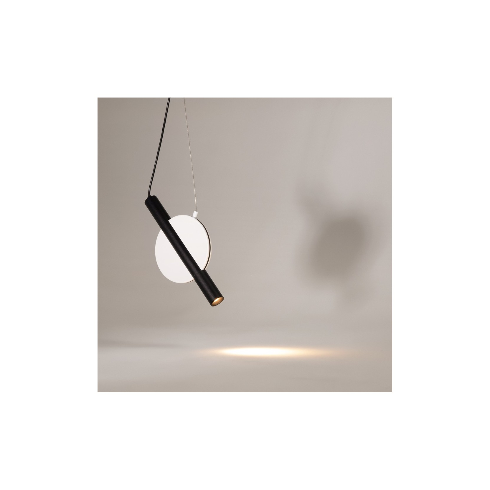 La suspension Enigma est une déclaration de style qui joue avec l'équilibre et la géométrie. Caractérisée par une composition audacieuse et asymétrique, cette lampe combine des éléments circulaires et tubulaires pour créer un point lumineux qui est aussi une sculpture d'avant-garde. Sa structure unique, soutenue par un jeu de câbles qui en soulignent la légèreté, la rend parfaite pour les environnements contemporains à la recherche d'une pièce iconique et hors du commun.