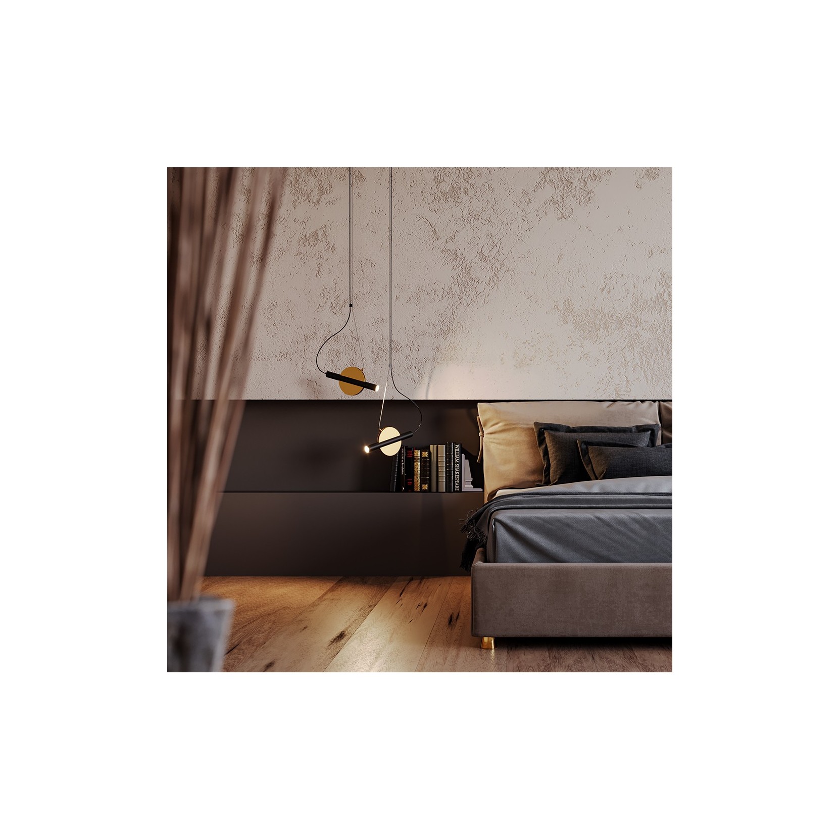 La suspension Enigma est une déclaration de style qui joue avec l'équilibre et la géométrie. Caractérisée par une composition audacieuse et asymétrique, cette lampe combine des éléments circulaires et tubulaires pour créer un point lumineux qui est aussi une sculpture d'avant-garde. Sa structure unique, soutenue par un jeu de câbles qui en soulignent la légèreté, la rend parfaite pour les environnements contemporains à la recherche d'une pièce iconique et hors du commun.