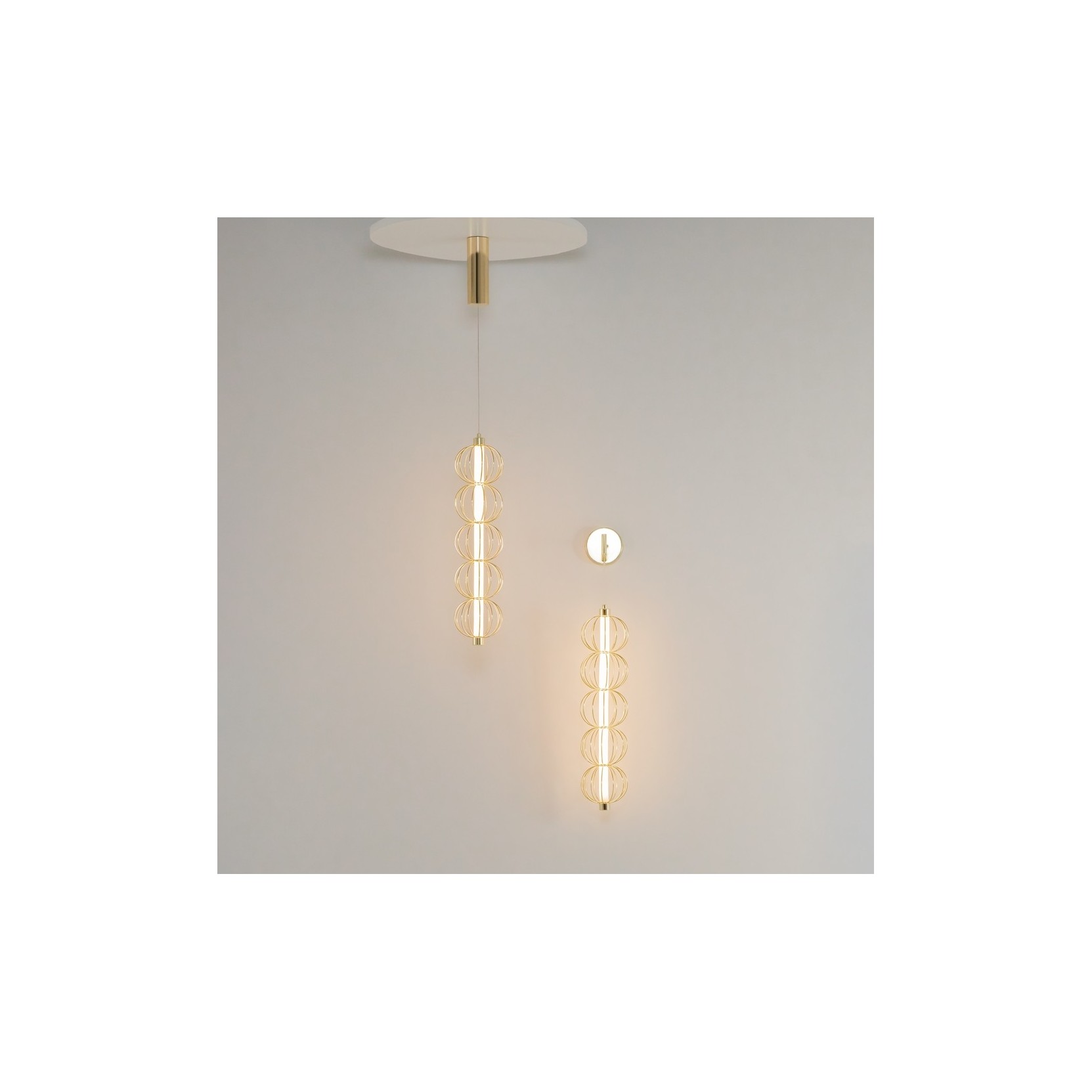 La lampe Golden Cage se distingue par une composition asymétrique et sculpturale. Une fine tige noire soutient un disque blanc et une source lumineuse cylindrique, positionnés dans un équilibre apparemment précaire qui attire immédiatement l'attention. La structure est surmontée d'un large disque supérieur faisant office de calotte réfléchissante, créant un jeu sophistiqué de proportions et d'ombres.