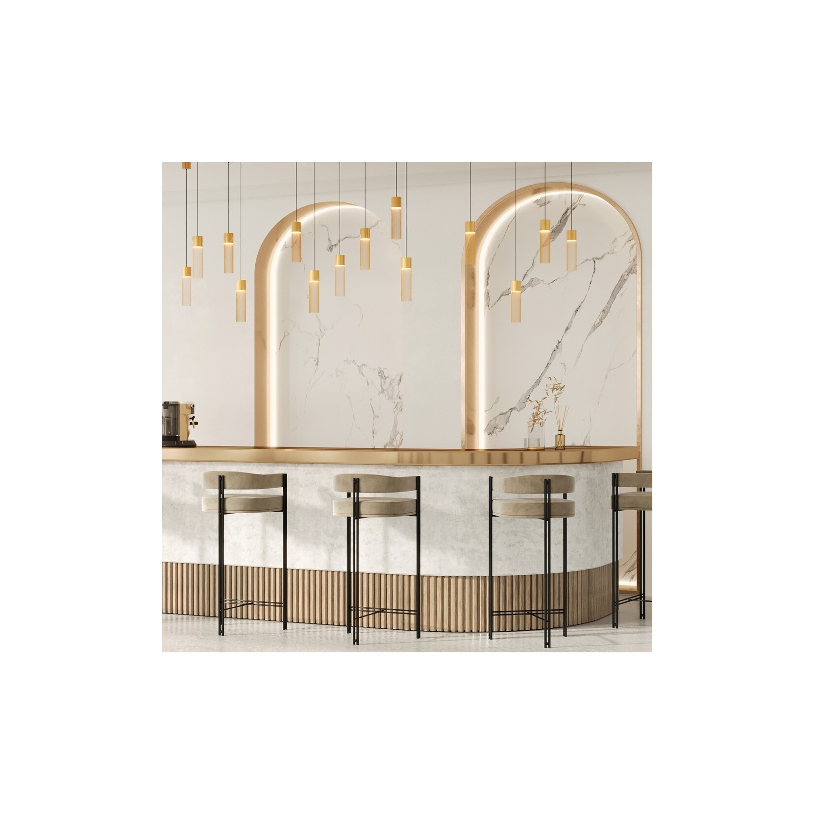 La lampe Imaginary se distingue par sa structure sculpturale et asymétrique. Caractérisée par une tige centrale fine en finition or satiné, la lampe soutient une barre horizontale qui semble flotter dans le vide. À l'une delle extrémités se trouve un cercle lumineux parfait (un anneau LED), tandis que la barre se prolonge vers le côté opposé, créant un sentiment d'extension infinie. Cette composition défie les lois de la statique, transformant un luminaire en une véritable installation d'art moderne.