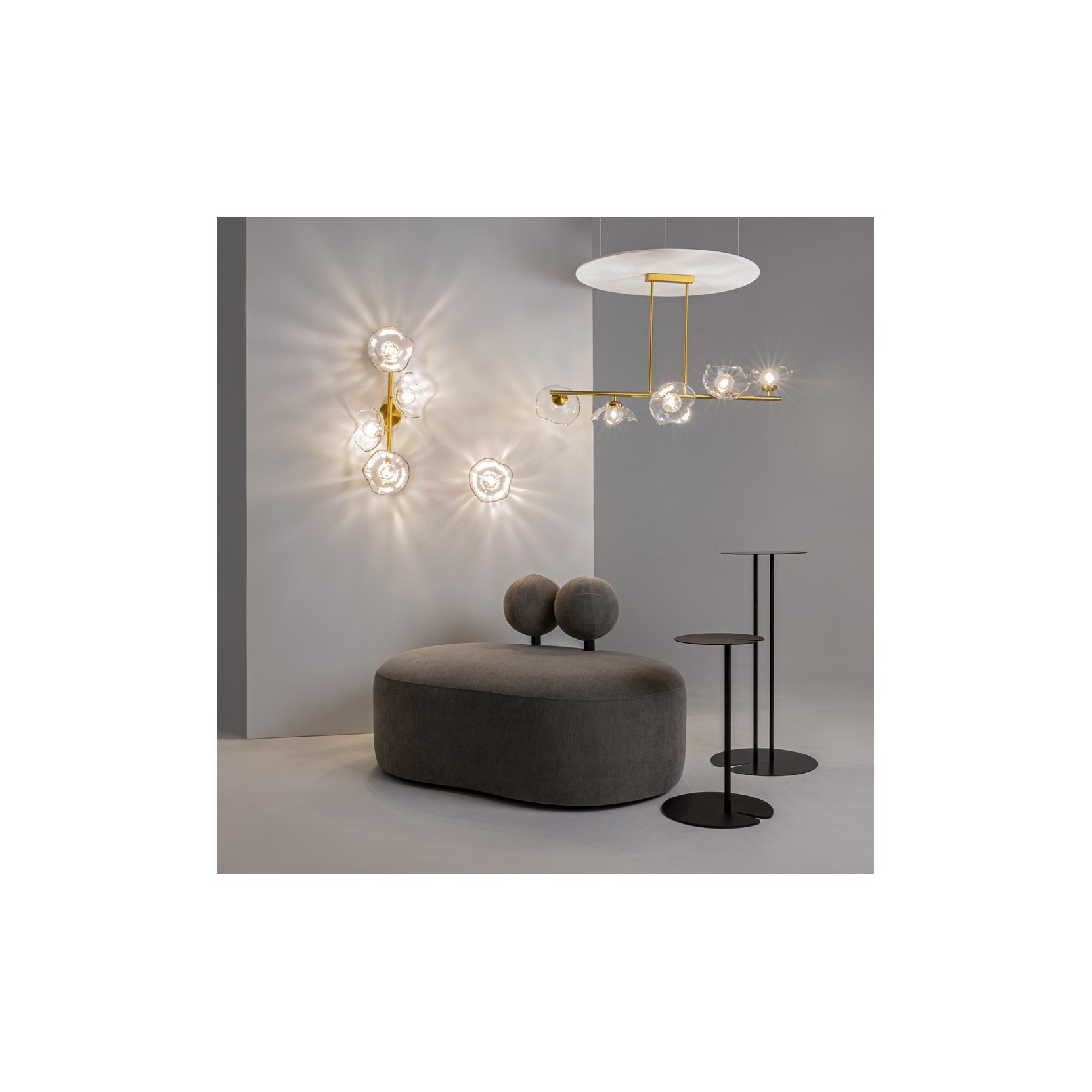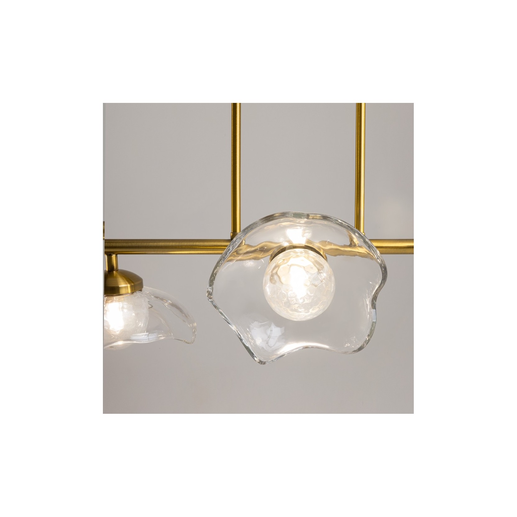La lampe Miracle se distingue par une structure horizontale à bascule en or satiné, soutenue par deux fines tiges verticales partant d'une rosace circulaire minimaliste. Le long de la barre principale sont enchâssés cinq diffuseurs en verre transparent de forme organique, rappelant des pétales de fleurs ou des bulles de savon à peine formées. Chaque diffuseur est unique dans son irrégularité, créant un effet de mouvement et de naturel qui brise la rigidité des lignes métalliques.