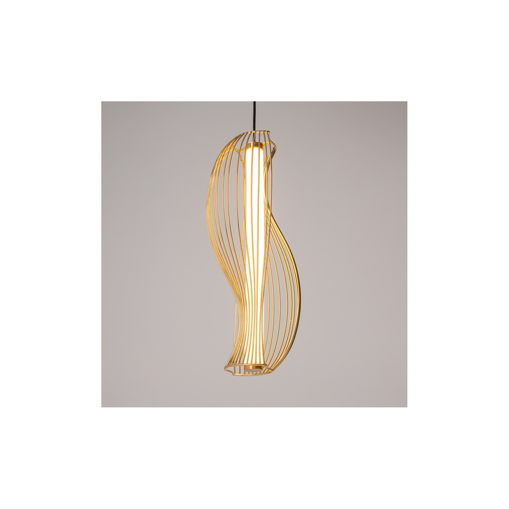 La suspension Shadow of the Past est un accessoire d'ameublement au fort caractère scénographique, qui réinterprète le concept de lampe tube à travers un design organique et fluide. Sa structure à double âme joue sur la tension entre rigidité métallique et douceur visuelle, créant un point lumineux qui semble flotter et danser dans l'espace.