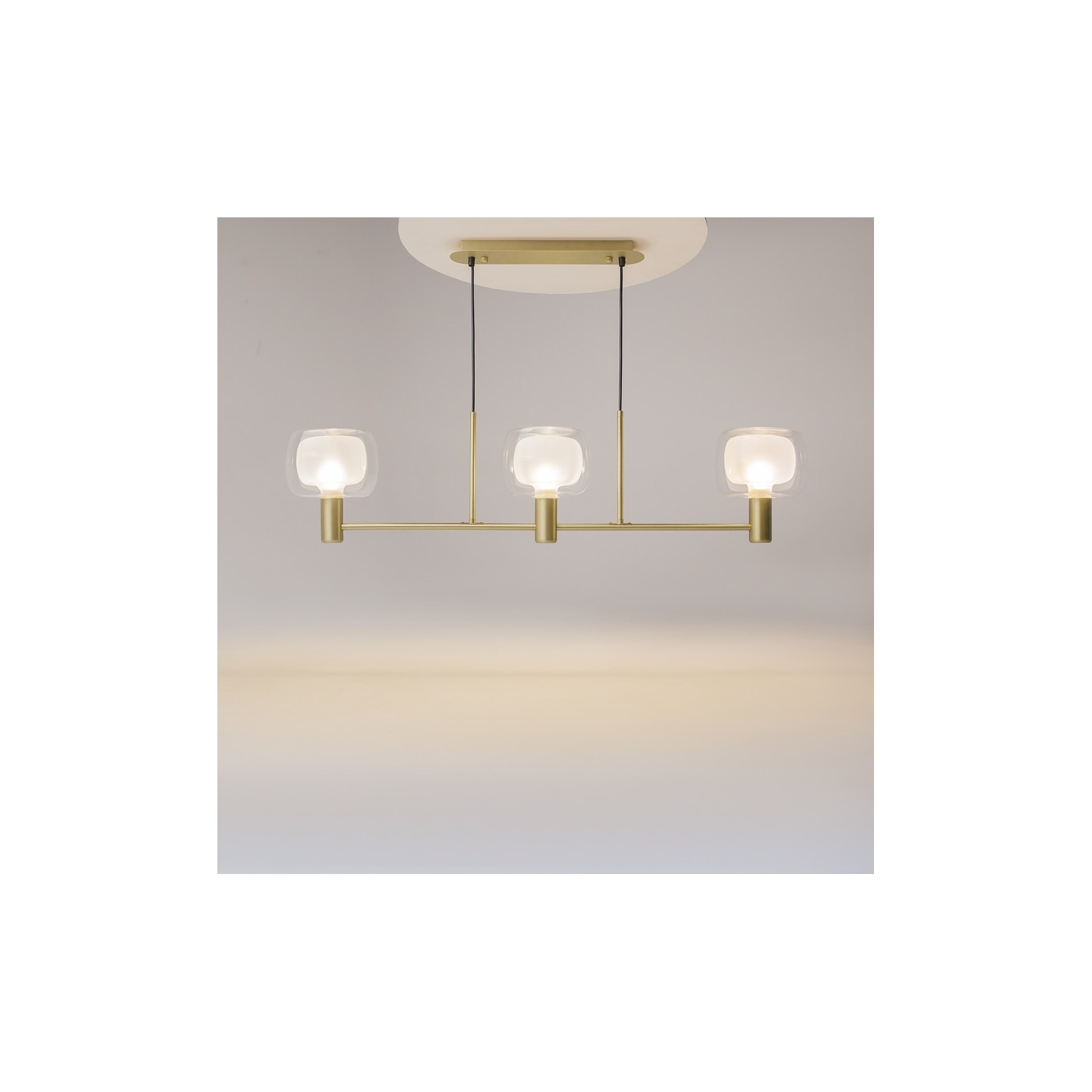 La suspension Vision est un système d'éclairage linéaire qui allie l'élégance de l'or satiné à la légèreté du verre soufflé. Son design horizontal ne fait un élément parfait pour définir les espaces de convivialité ou de travail avec une touche de modernité sophistiquée.