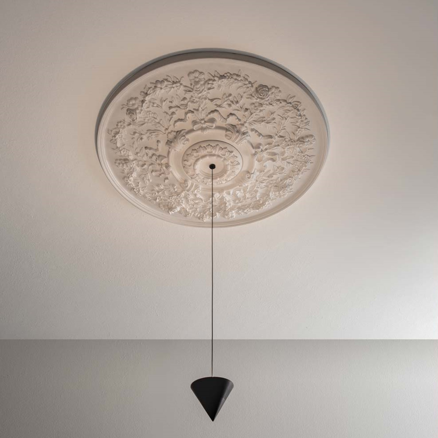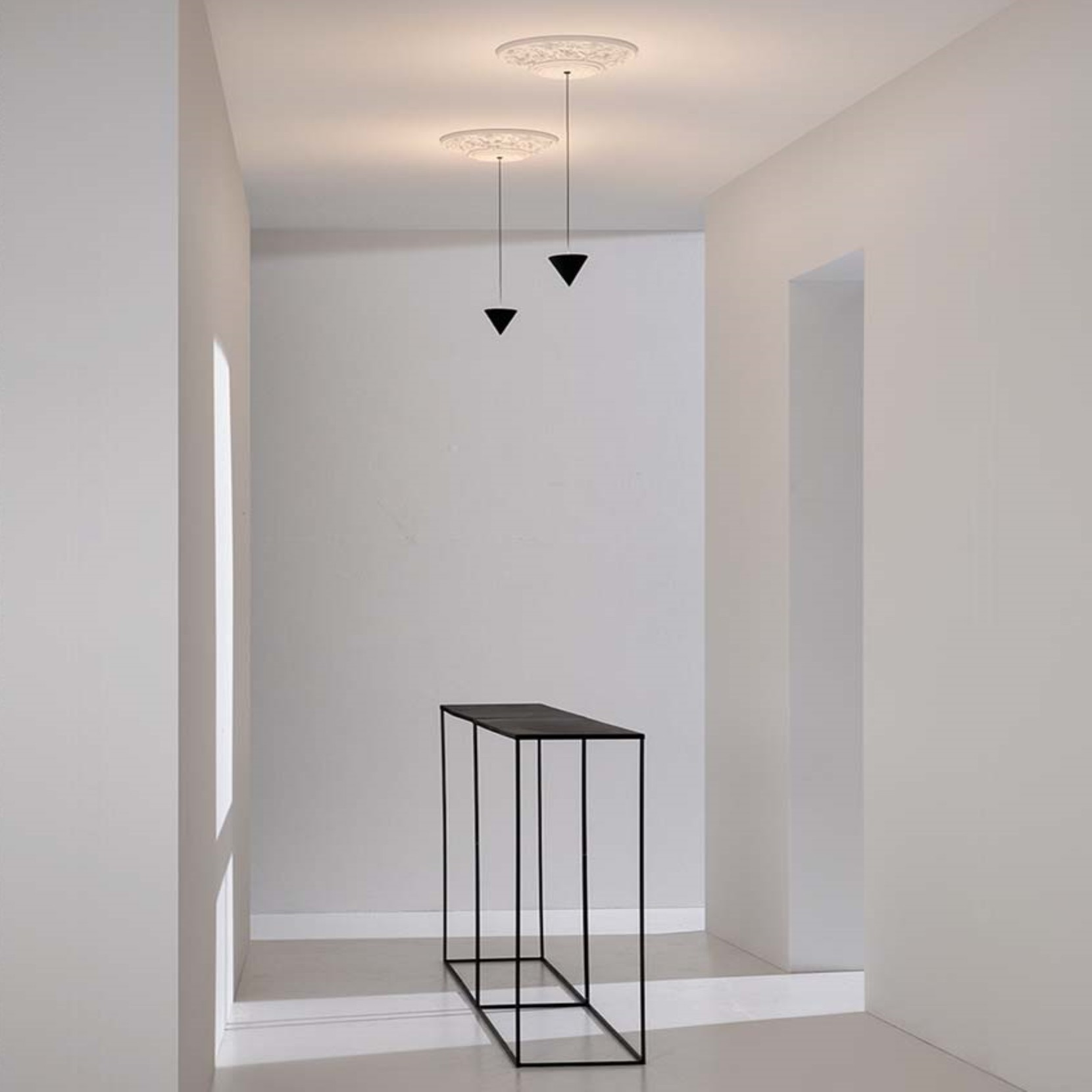 Moonbloom est une collection de lampes à suspension dessinée par Matteo Ugolini, avec une structure en aluminium noir mat et une rosace en plâtre blanc. Avec un design particulier, la collection , est apte à éclairer et meubler tout type de pièce.