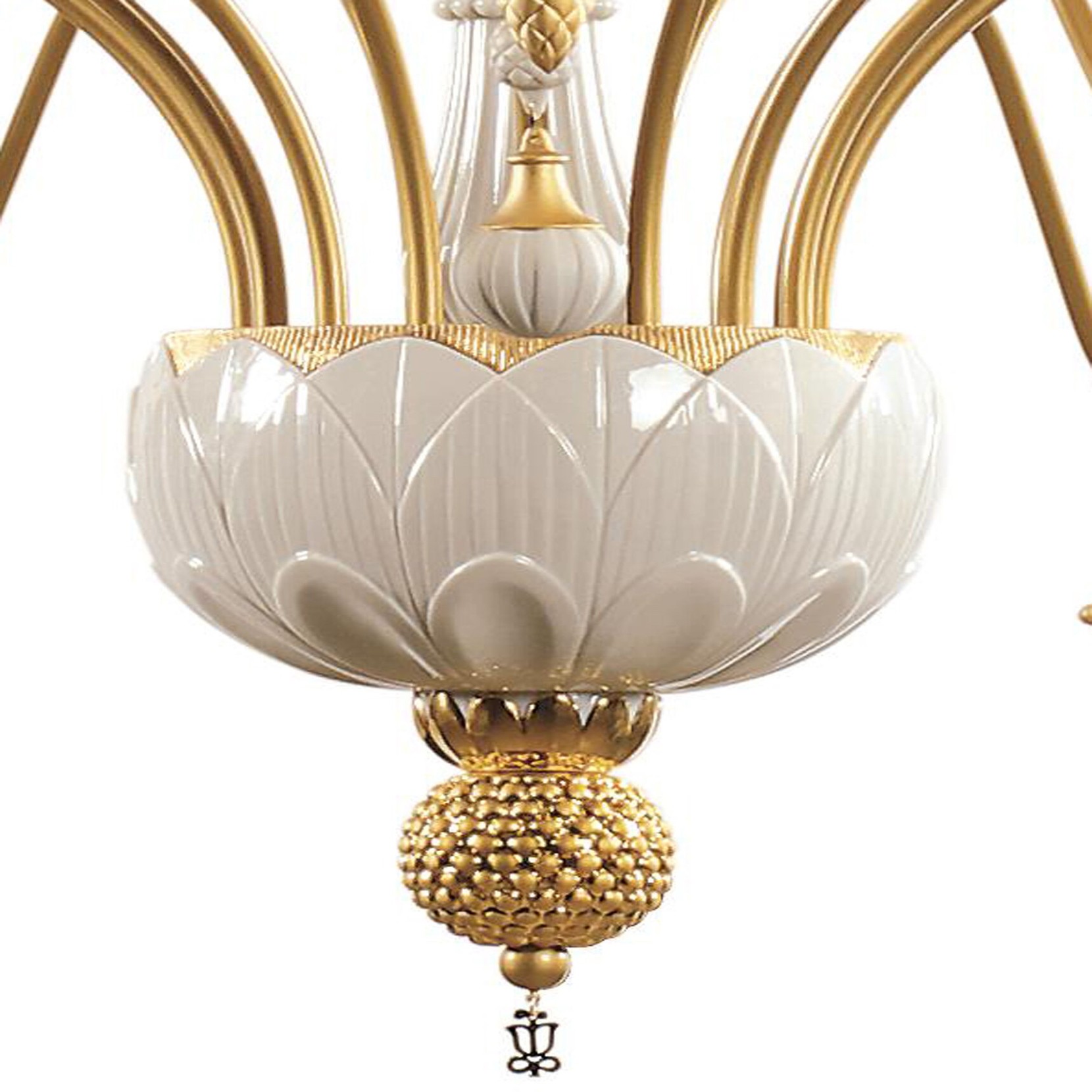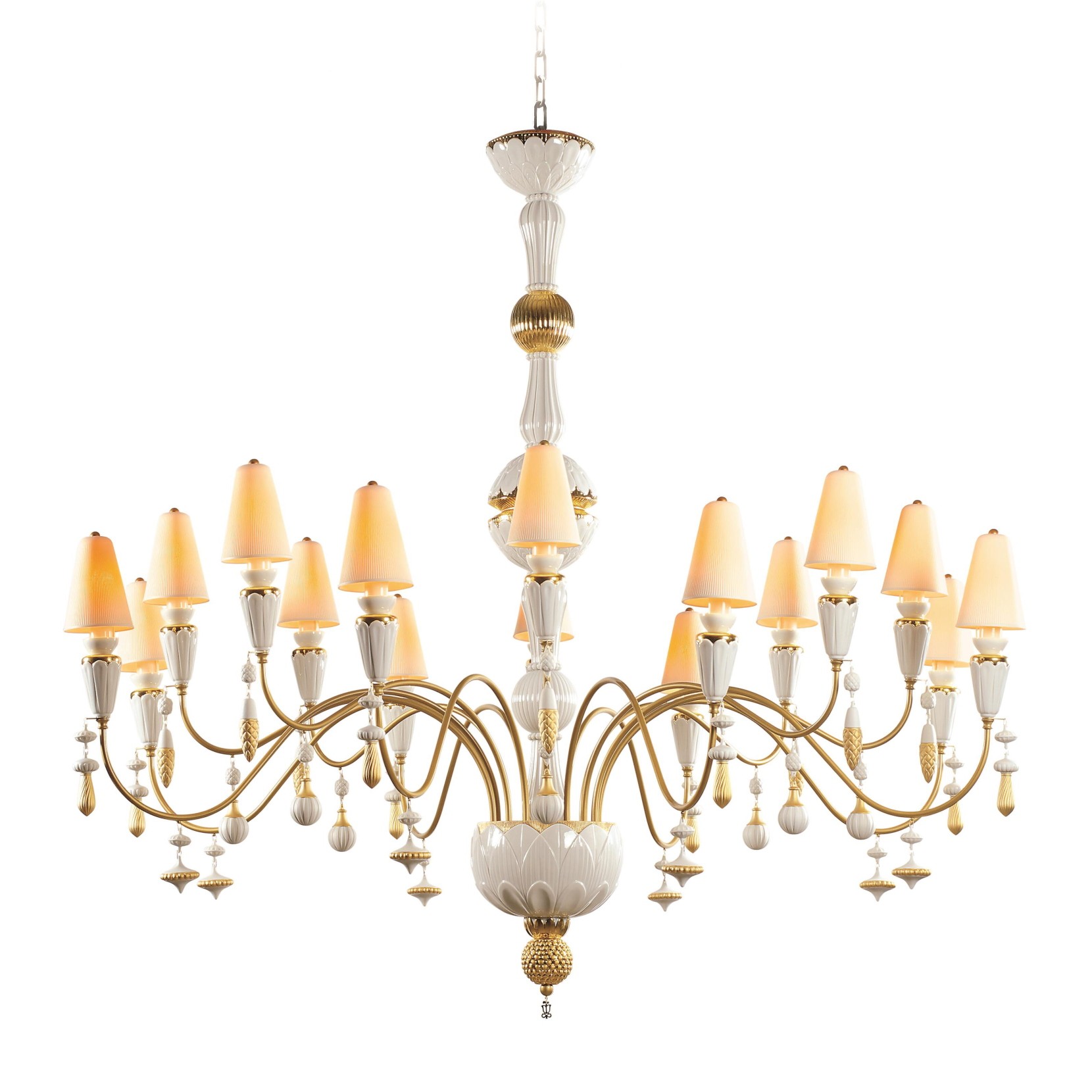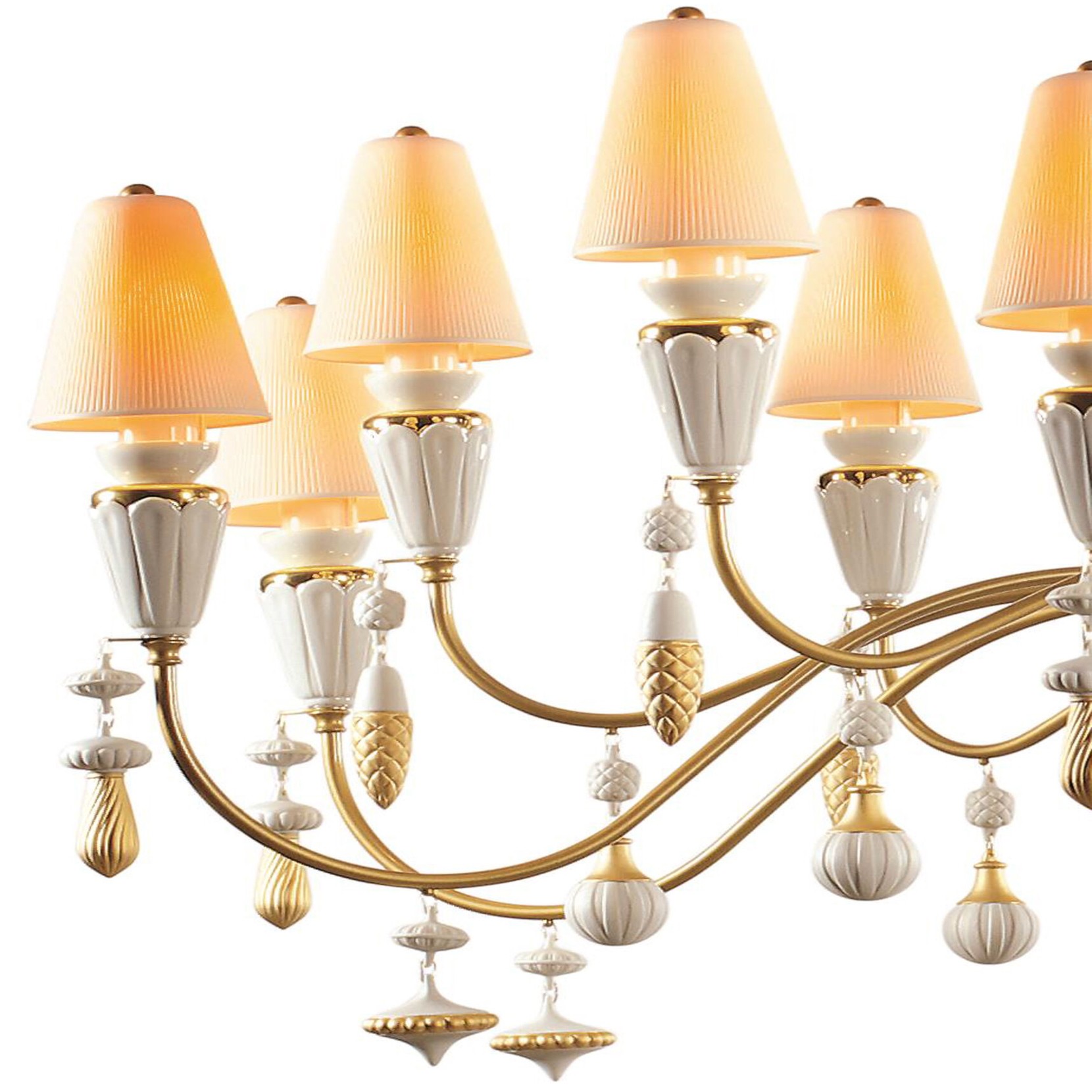 Lampe à suspension à seize feux inspirée de motifs végétaux, interprétés par des lignes rondes, organiques et géométriques. Dans le design de la collection prédominent les formes synthétiques, féminines, transformées, sans bords, typiques de la porcelaine. Les pendentifs rappellent des graines et des bulbes ; les bases des lumières et dautres éléments de la partie centrale nous rappellent des feuilles et des fleurs en phase de floraison ; les lithophiles sinspirent de formes de champignons sauvages. Décoré avec des émaux blanc et or et des accessoires dans une combinaison de finitions brillantes et mates.